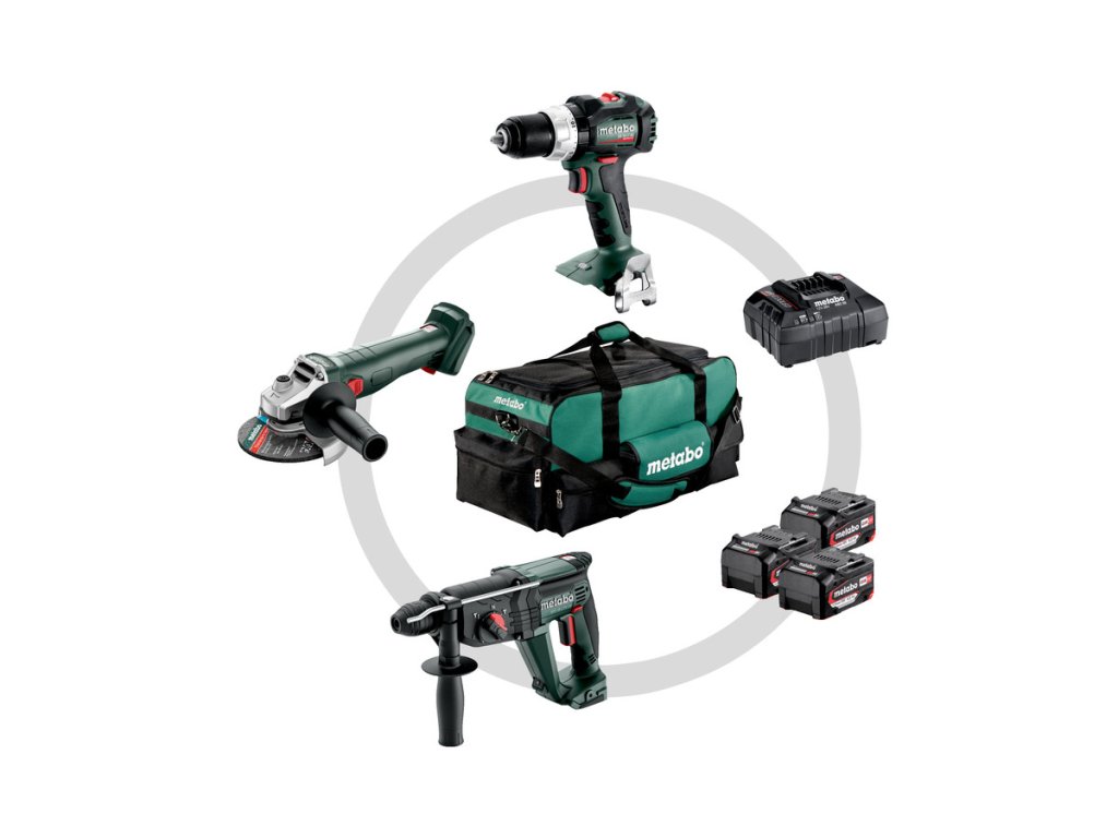 - Akumulátorová příklepová vrtačka SB 18 LT BL, akumulátorová úhlová bruska W 18 L 9-125 Quick, akumulátorové kombinované kladivo KH 18 LTX 24, 3 akumulátorové články Li-Power (18 V/5,2 Ah), nabíječka ASC 55, brašna na nářadí (velká)