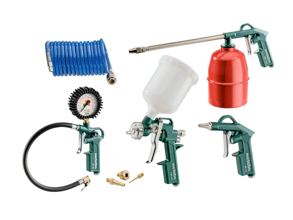 - Sada se skládá z ofukovací pistole, měřicího přístroje pro huštění pneumatik vč. adaptéru a jehly k nafukování míčů, stříkací pistole na barvu s nádobou, stříkací pistole a spirálové hadice PA