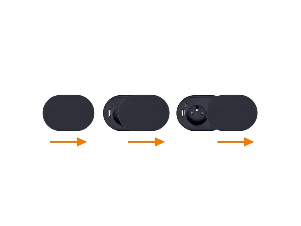 Posuvné víčko v matném černém provedení působí elegantně a nenápadně. Posuvný mechanismus chrání zásuvku i nabíjecí porty před prachem a nečistotami. Navíc lze odhalit jen USB porty a síťovou zásuvku ponechat zakrytou. Zakryté víčko zachovává čistý vzhled pracovní plochy.