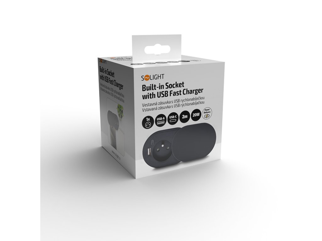 Solight 1z + USB A+C 20W PD vestavná zásuvka s posuvným víčkem, 2m, matná černá