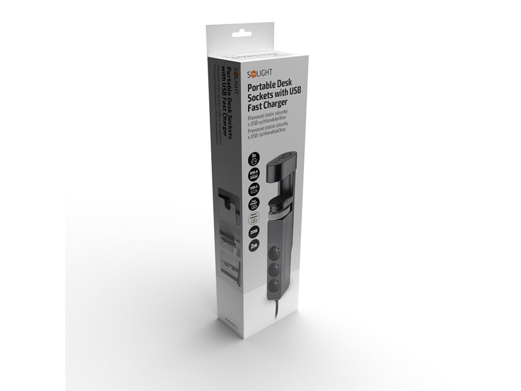 Tato přenosná stolní zásuvka Solight je ideálním řešením pro situace, kdy nechcete nebo nemůžete zasahovat do desky stolu. Blok se rychle a jednoduše připevní z boku pomocí otočného mechanismu, bez nutnosti vrtání. Vhodné nejen pro domácnosti, ale také do firemních prostor, showroomů nebo konferenčních místností, kde je důležitý čistý a reprezentativní vzhled nábytku.