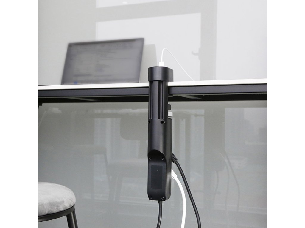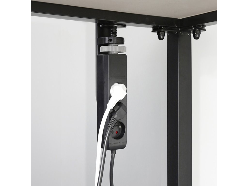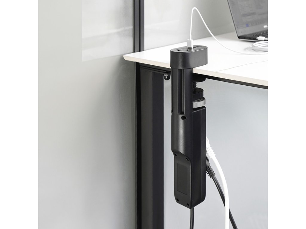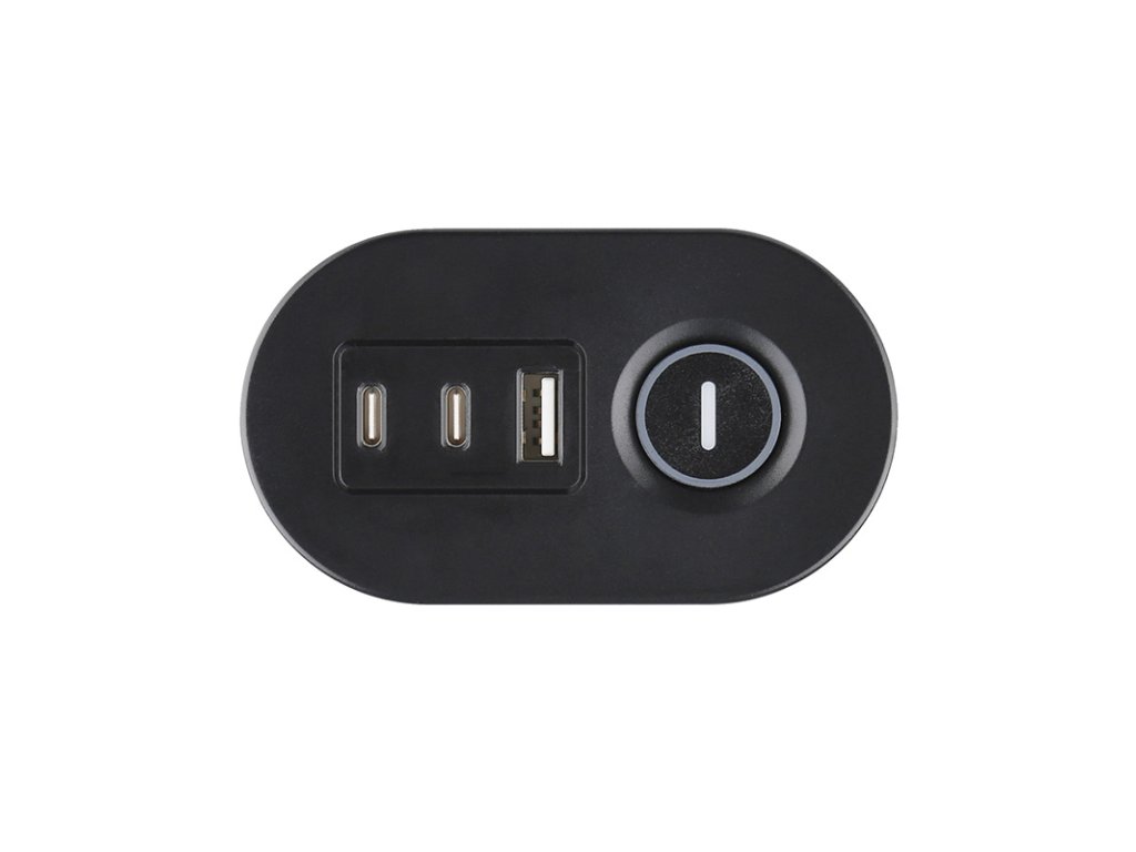 Nabíjecí porty USB-A a USB-C s podporou rychlého nabíjení jsou umístěny na čele prodlužovacího přívodu, a jsou tak snadno dostupné přímo z pracovní plochy. Tři zásuvky 230V jsou elegantně ukryté pod hranou stolu, takže nenarušují vizuální čistotu a nepřekáží na pracovním místě. Zásuvkový blok lze v případě potřeby namontovat i obráceně – zásuvkami vzhůru.