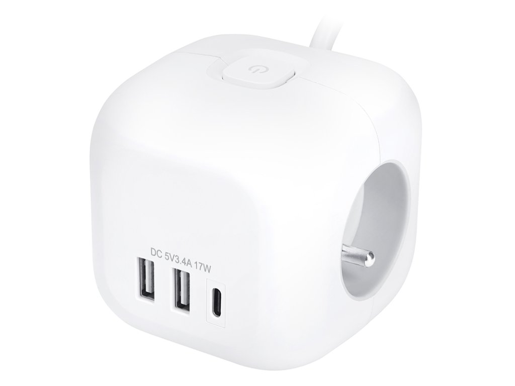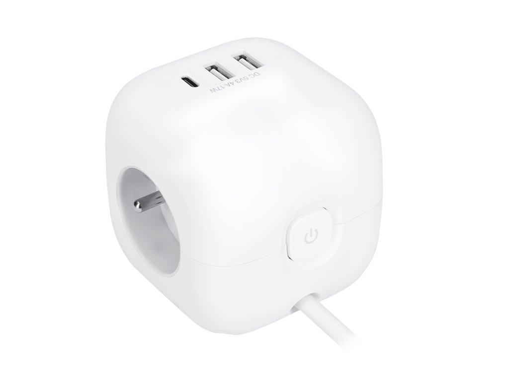 Prodlužovací přívod ve tvaru kostky s délkou strany 8 cm spojuje tři uzemněné zásuvky s dětskou pojistkou a USB nabíječku s porty USB-C a USB-A. Díky 2m dlouhému kabelu poskytuje flexibilní využití. Protiskluzové podložky udržují přívod stabilní na stole nebo pracovní ploše. Podsvětlený vypínač umožňuje snadné ovládání všech zásuvek i USB portů.