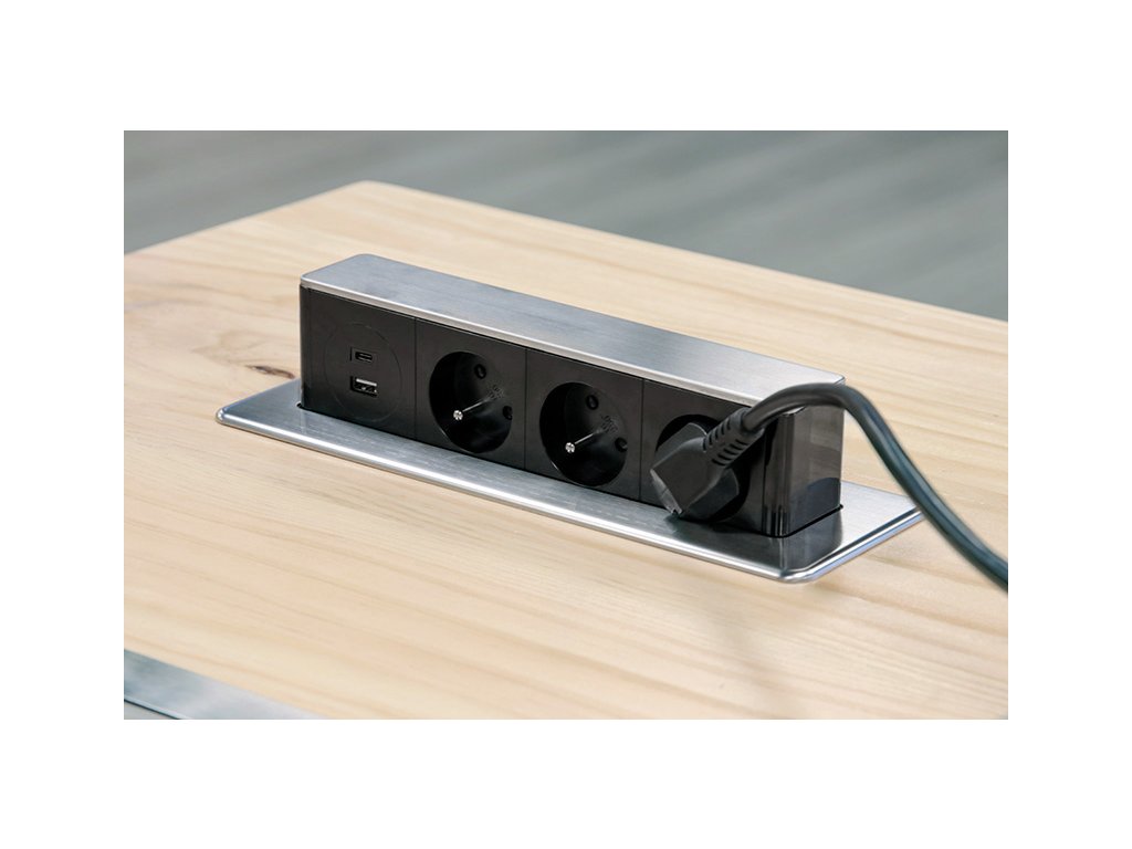 Výsuvný blok se zásuvkami je praktickým doplňkem pro pracovní desky a stoly, který umožňuje snadný přístup k elektrickým přípojkám pouze tehdy, když je to potřeba. Díky tomu šetří místo a udržuje pracovní plochu přehlednou. Vrchní kryt z nerezové oceli ve stříbrné barvě dodává moderní vzhled a zajišťuje odolnost vůči každodennímu používání.