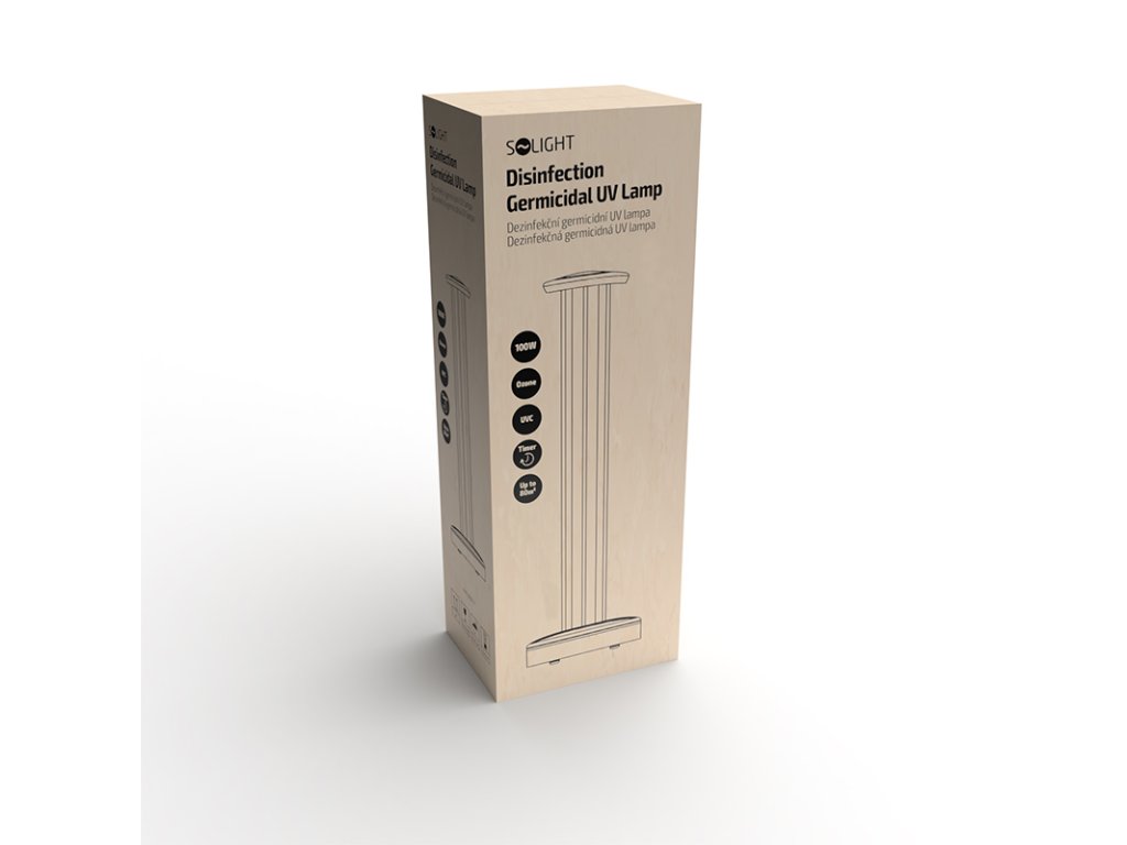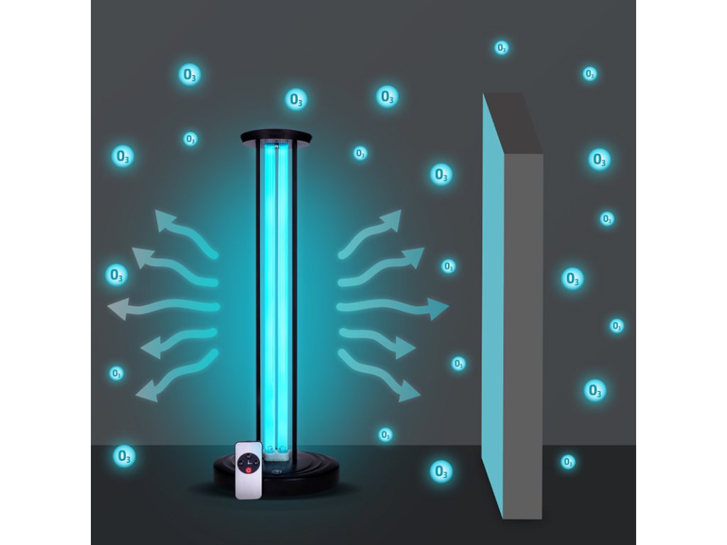 Tato přenosná germicidní lampa s výkonem 100 W dezinfikuje prostory až do 80 m2 pomocí UV-C záření a ozónu. Inteligentní senzor automaticky vypne lampu při detekci osob a znovu ji zapne po jejich odchodu. Likviduje viry, bakterie, plísně a roztoče, přičemž je 3000× rychlejší než chlór a 25× efektivnější než kyselina chloritá. Časovač umožňuje nastavení na 15/30/60 minut. Lampa je vybavena dálkovým ovládáním s dosahem 15 m, má životnost zářiče až 5000 hodin a křemíkovou trubici s ABS konstrukcí. Napájení 230V/50Hz, délka kabelu 1,2 m. Hmotnost 1,3 kg, černá barva.