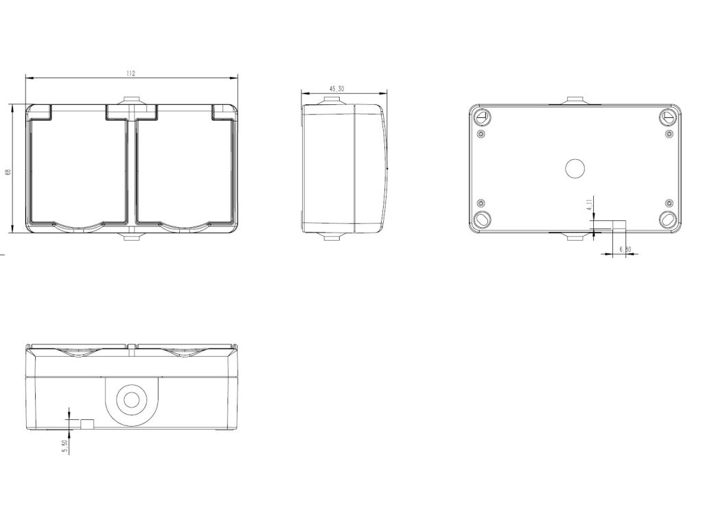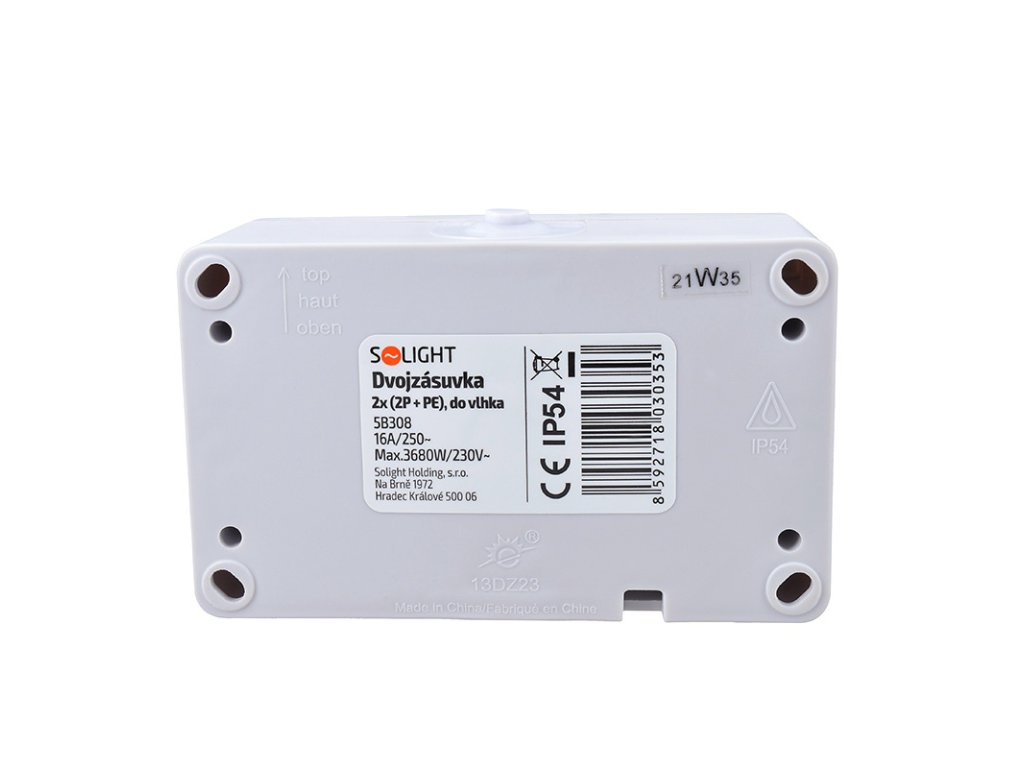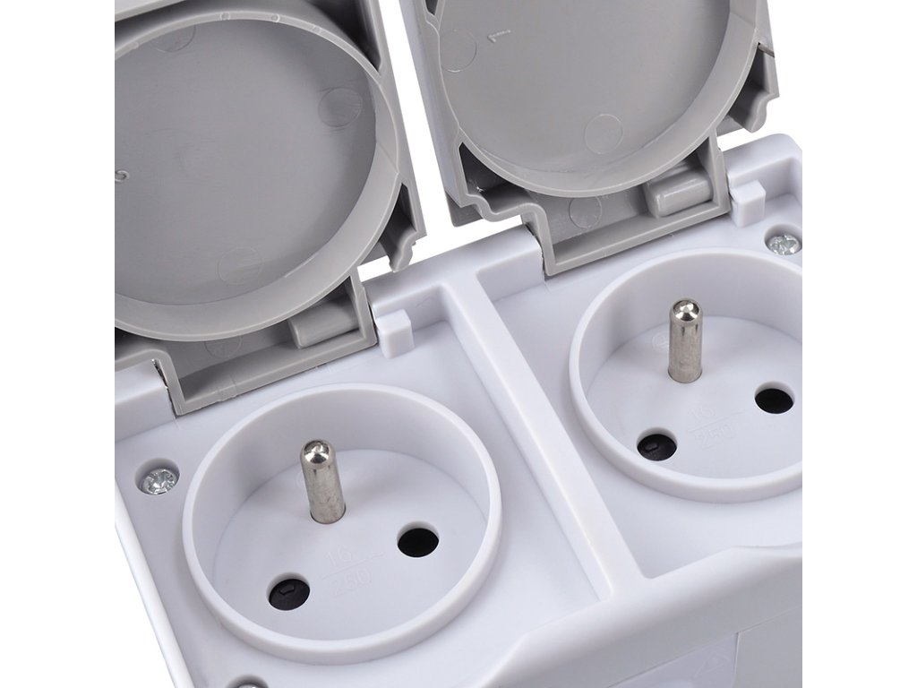Zásuvka je navržena pro maximální zátěž 3680 W, tzn. celkové proudové zatížení 16 A při napětí v síti 230 V~. Krytí IP54 zajišťuje odolnost vůči stříkající vodě i prachu. Samouzavírací víčka a dětské pojistky zajišťují maximální bezpečnost. Jednoduché a spolehlivé řešení pro každodenní použití venku i uvnitř.