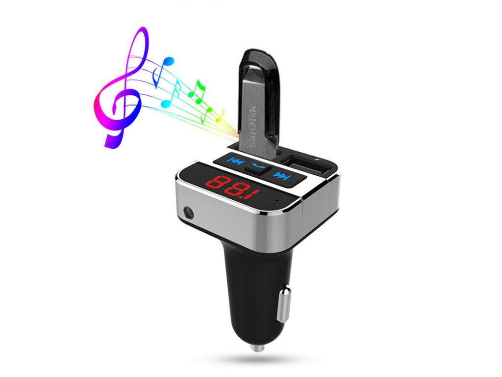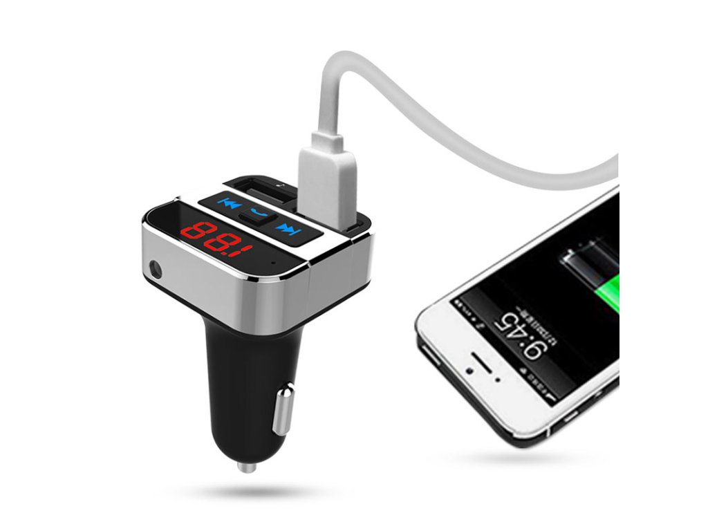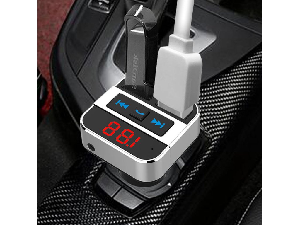 Bluetooth FM transmitter – hudba, nabíjení a handsfree v jednom. Tento Bluetooth FM transmitter umožňuje bezdrátové přehrávání hudby z mobilních zařízení, MP3 přehrávačů nebo USB disků (až 64 GB). Disponuje LED displejem, dvěma USB porty (5V/2.4A + 5V/1A) pro rychlé nabíjení a podporou AUX audio vstupu. Umožňuje HiFi stereo přenos s frekvenčním rozsahem 87,5 – 108 MHz a podporuje formáty MP3/WMA/A2DP. Napájení 12–24V, ideální pro osobní i nákladní vozy.
