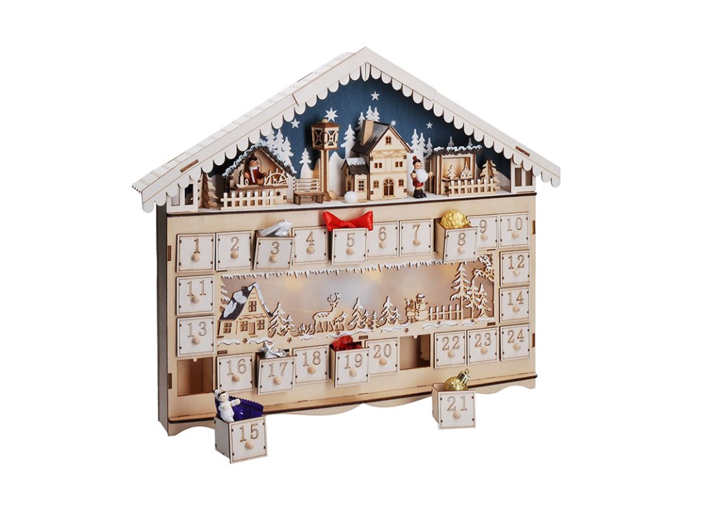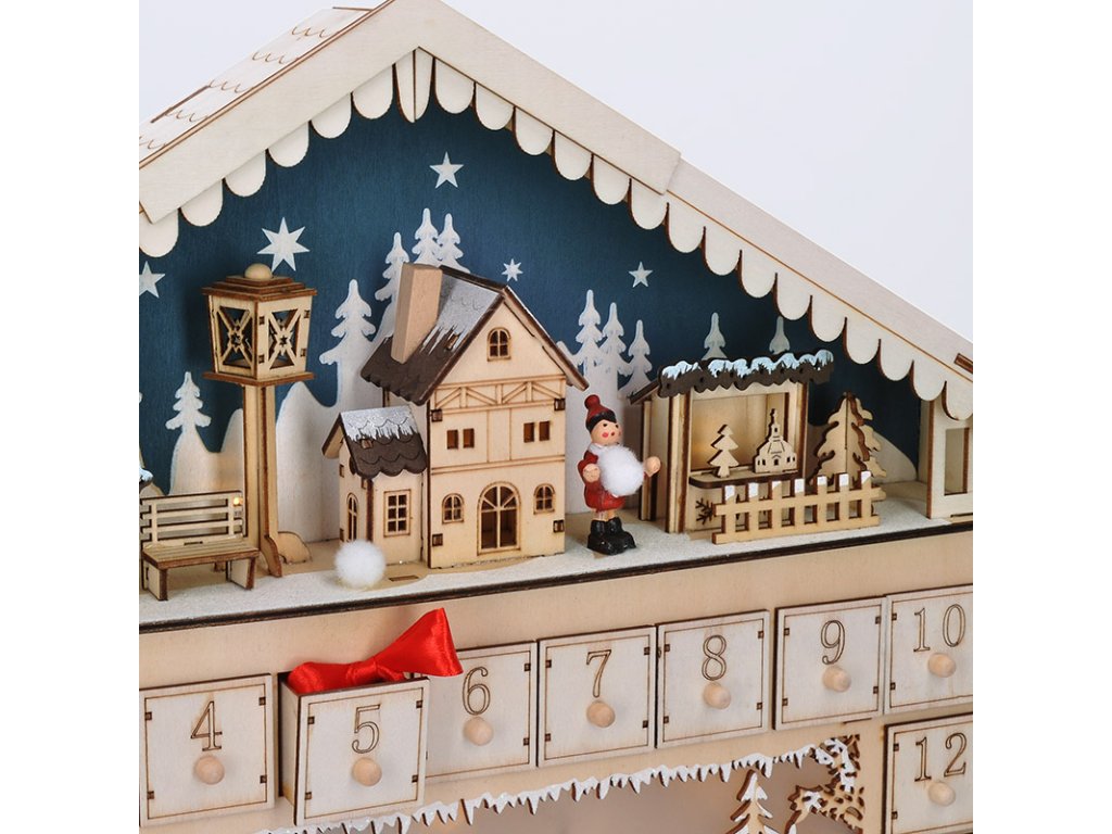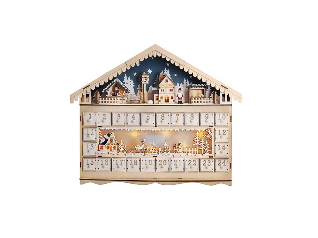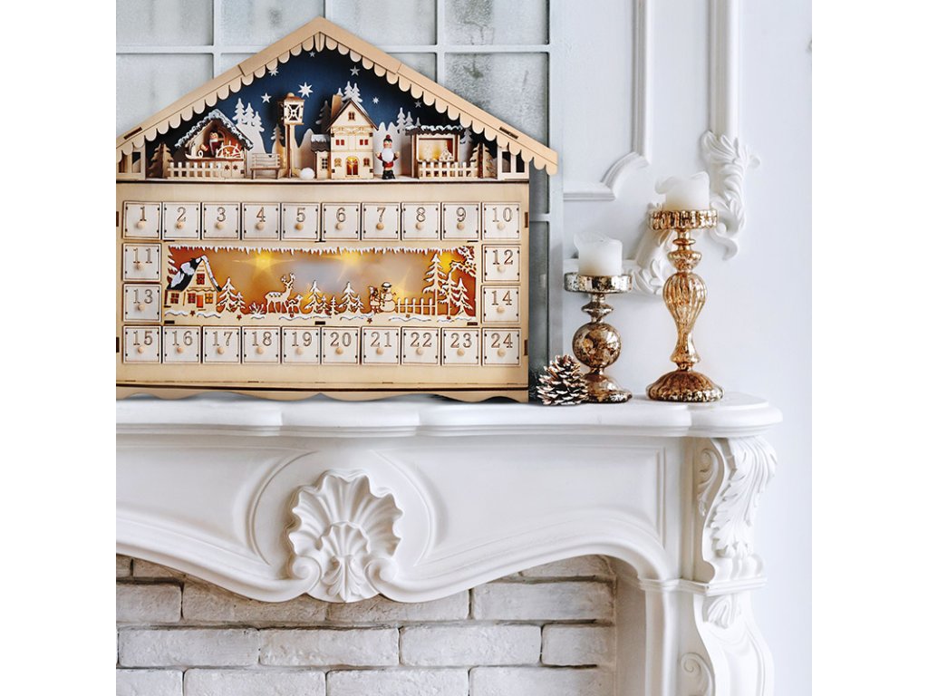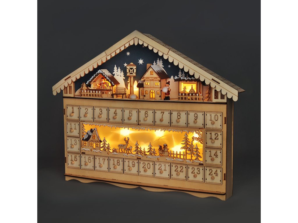 Stylový LED adventní kalendář ve tvaru horské chaty je nádhernou dekorací, která zpříjemní čekání na Vánoce. S rozměry 50 × 40 × 6 cm působí velmi dominantně, a přesto útulně. Vyrobený z kvalitního dřeva v přírodní hnědé barvě přináší do domácnosti pocit tepla a tradiční sváteční atmosféru. Kalendář je vybaven 10 teple bílými LED diodami, které decentně osvětlují jednotlivé prvky dekorace a vytvářejí příjemné večerní osvětlení.