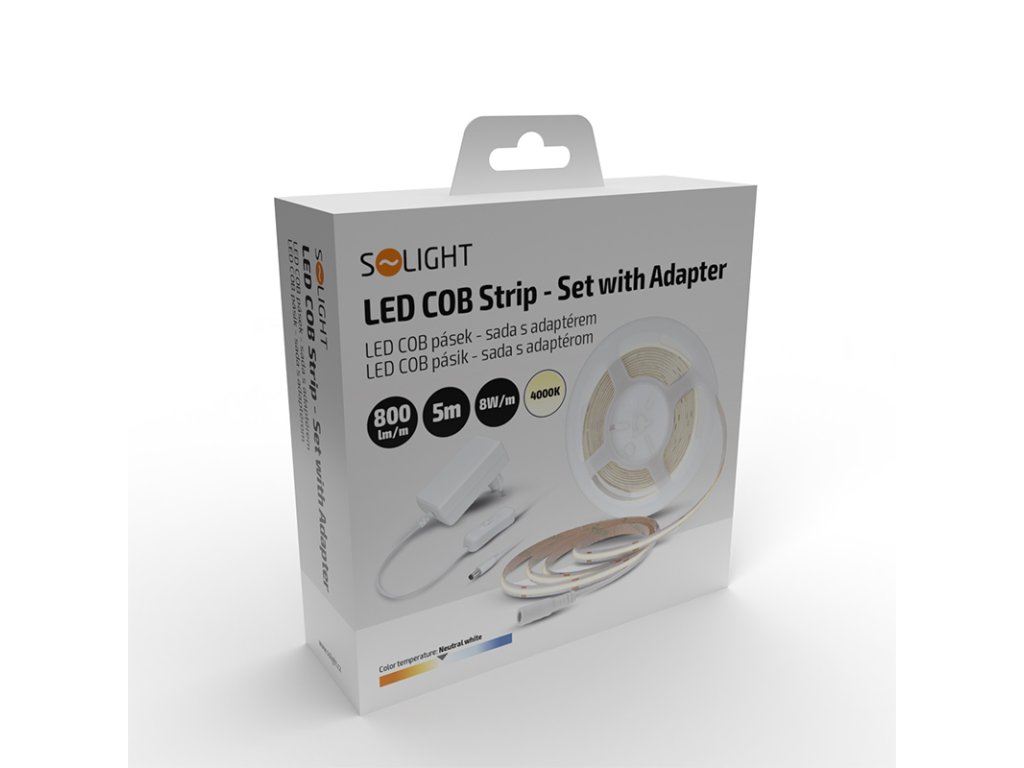 Solight LED COB pásek, sada s adaptérem, vypínač, 5m, 8W/m, 800lm/m, neutrální bílá