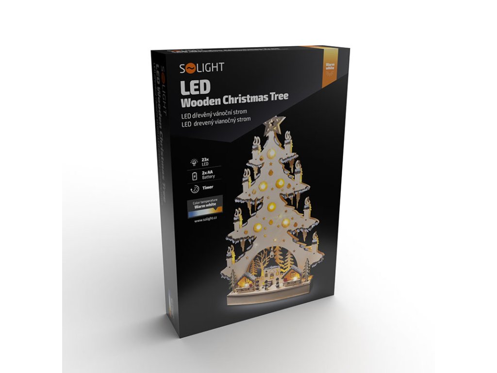 Solight LED dřevěný vánoční stromek s dekoracemi, 23x LED, přírodní barva, 64cm, 2x AA
