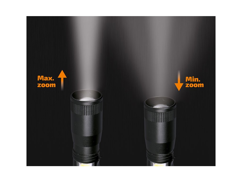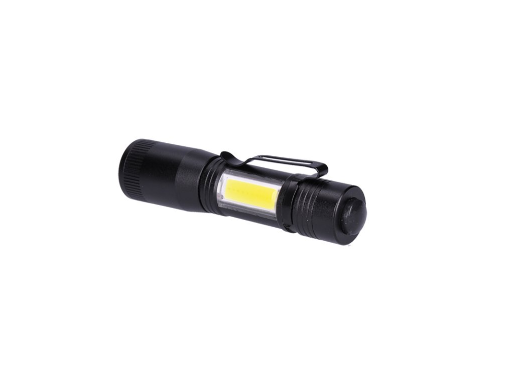 Kvalitní kovová LED svítilna s hlavním 3W zdrojem a přídavným bočním COB světlem nabízí 4 režimy svícení – 100 %, 50 %, COB 100 % a blikání COB. Tělo z hliníku je vybaveno možností regulace světelného kuželu (zoom/fokus) a zajišťuje odolnost i při náročnějším použití.