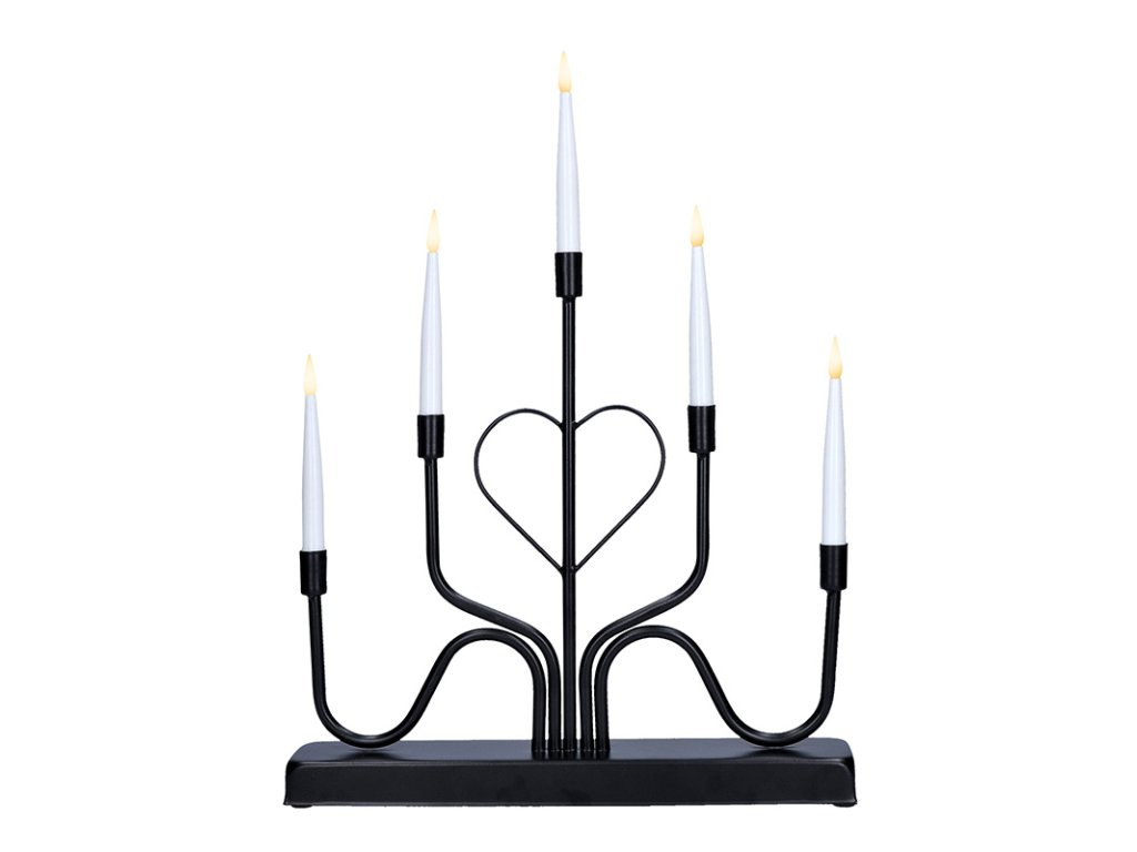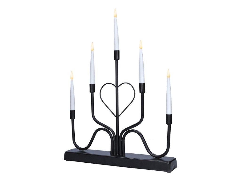 Moderní pětiramenný svícen v černé barvě je elegantní kombinací klasiky a současného designu. Každé z pěti ramen je osazeno LED diodou s teplým bílým světlem, které navozuje klidnou, sváteční atmosféru. Rozměry svícnu jsou 32 × 42 cm, díky čemuž je ideální pro umístění na stůl, parapet nebo komodu.