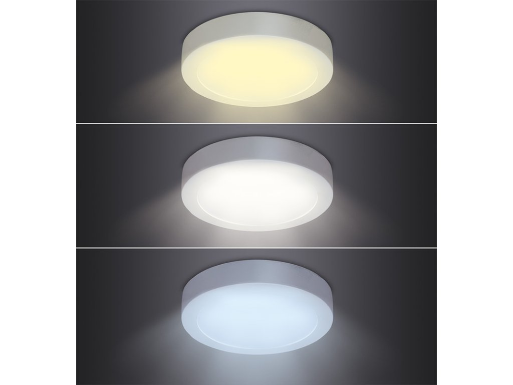 Silný a efektivní kulatý přisazený LED panel s výkonem 24 W je navržen pro osvětlení větších místností s důrazem na kvalitu a rovnoměrné rozložení světla. Pomocí přepínače můžete volit mezi teplotami světla 3000K, 4000K nebo 6000K a přizpůsobit tak atmosféru prostoru dle potřeby. Se světelným tokem 1800 lm a širokým úhlem svícení 160° je ideální do kanceláří, obývacích pokojů nebo komerčních prostor.