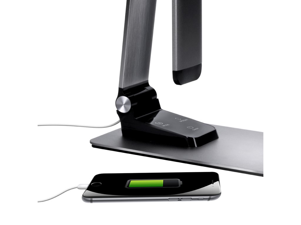 Lampička s příkonem 11 W poskytuje světelný tok až 550 lm a široký úhel svícení 120°. Nabízí také USB výstup (5V, 1000mA) pro nabíjení mobilních zařízení – kabel je součástí balení. Robustní konstrukce z hliníku se stěnou o síle 6 mm dodává lampičce stabilitu a dlouhou životnost. Rozměry: 393 x 120 x 450 mm, napájení AC 100–240V, výstup DC 12V, délka kabelu 140 cm. Barva: stříbrná. Energetická třída G.