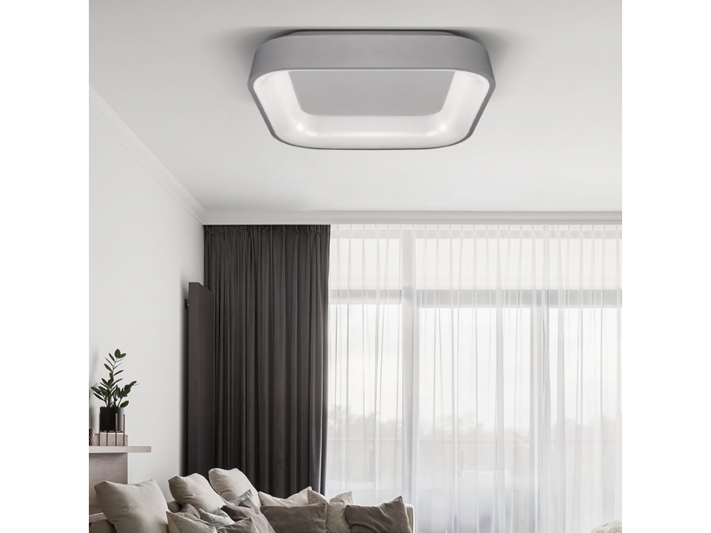 Díky použitým materiálům (Fe + PS) a elegantnímu šedému designu působí svítidlo moderně a nadčasově. Rozměry 450 × 450 × 100 mm zaručují působivý vzhled na stropě i stěně. Krytí IP20 je vhodné pro použití v interiéru, a dlouhá životnost LED (20 000 h) přispívá k bezúdržbovému provozu. Svítidlo patří do energetické třídy G a představuje ideální kombinaci výkonu, designu a funkčnosti pro chytrou domácnost.