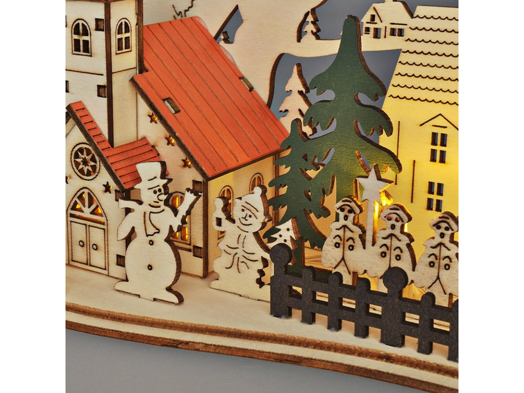 Dřevěná dekorace ve tvaru malebného vánočního městečka s dominantním kostelem je stylovým prvkem každé sváteční výzdoby. Tři teple bílé LED diody jemně podsvěcují jednotlivé prvky scény, čímž vytváří kouzelnou atmosféru. Rozměry 30 × 19 × 9 cm z něj dělají výraznou dekoraci pro okenní parapet, krbovou římsu či stůl.