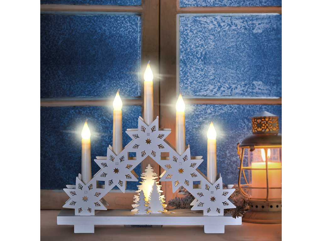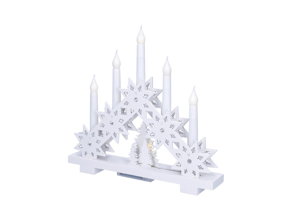 Stylový dřevěný svícen s pěti LED diodami a motivem hvězd přináší moderní pojetí klasické vánoční dekorace. Bílý povrch v kombinaci s čistými liniemi působí elegantně a vkusně, zatímco teple bílé světlo navozuje klidnou a sváteční náladu. Svícen má rozměry 32 × 30 × 5 cm a perfektně vynikne na parapetu, polici nebo slavnostně prostřeném stole.