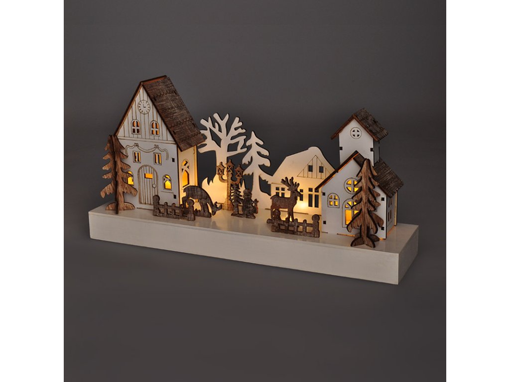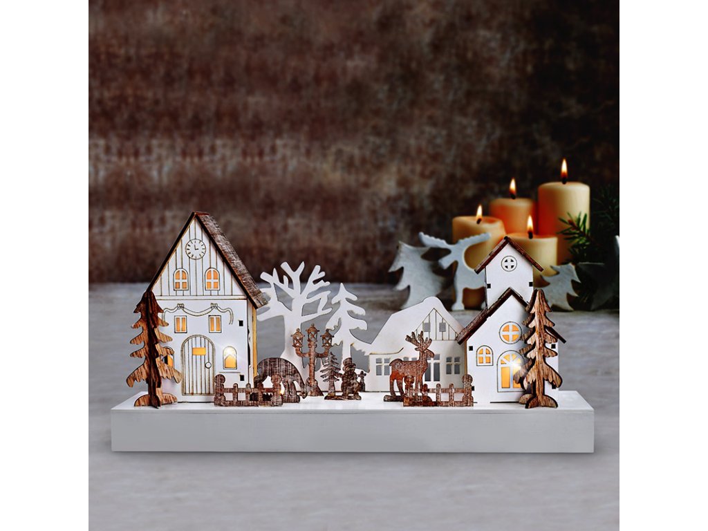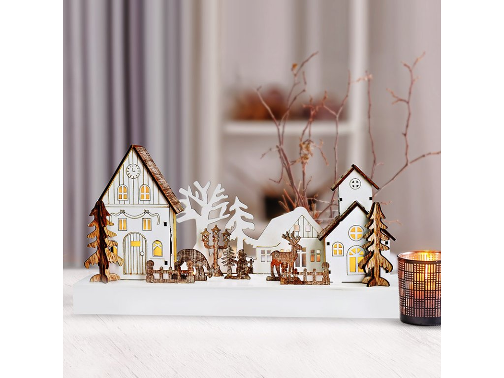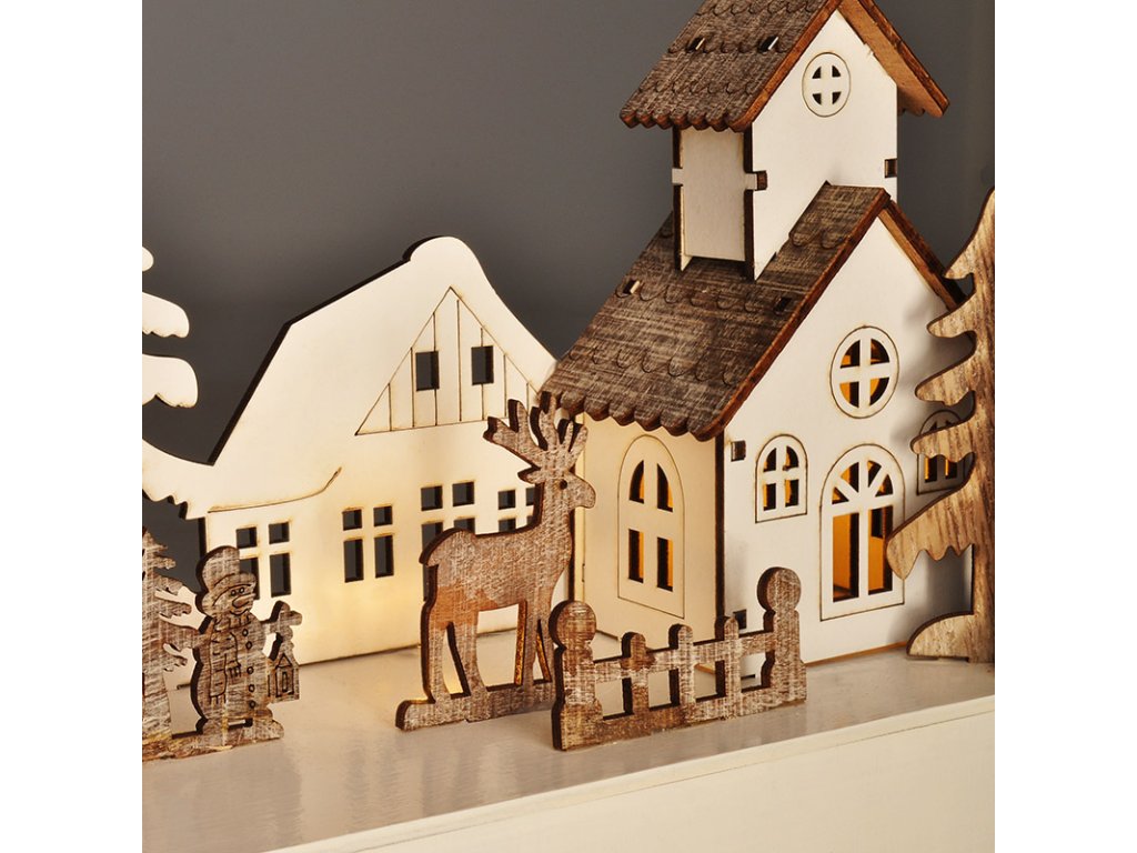 Tato dřevěná dekorace v podobě malebné vánoční vesničky nabízí jemné osvětlení pomocí čtyř LED diod s teplou bílou barvou. Propracované detaily domků a stromečků v kombinaci s přírodními materiály působí útulně a tradičně. Rozměry 34 × 8 × 17 cm ji činí ideální pro použití na poličku, parapet nebo komodu.