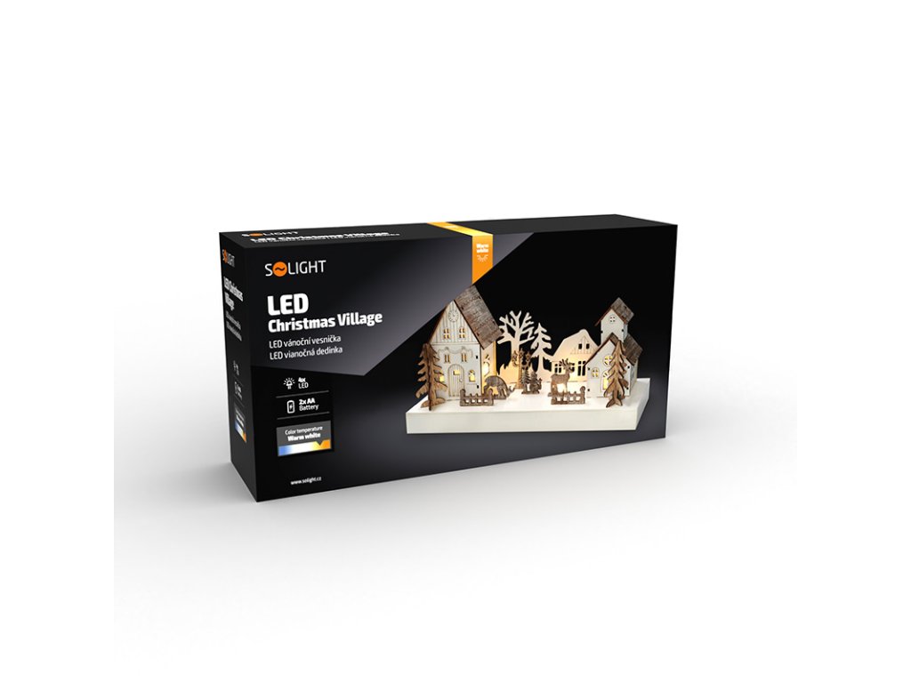 Solight LED vánoční vesnička, 34x17cm, dřevo, 4 LED, 2x AA