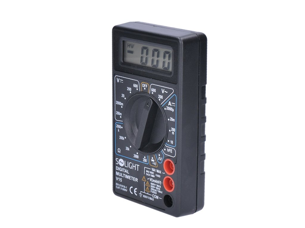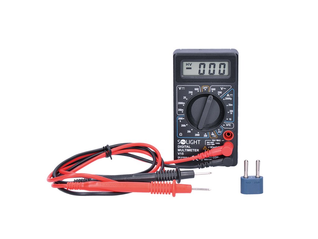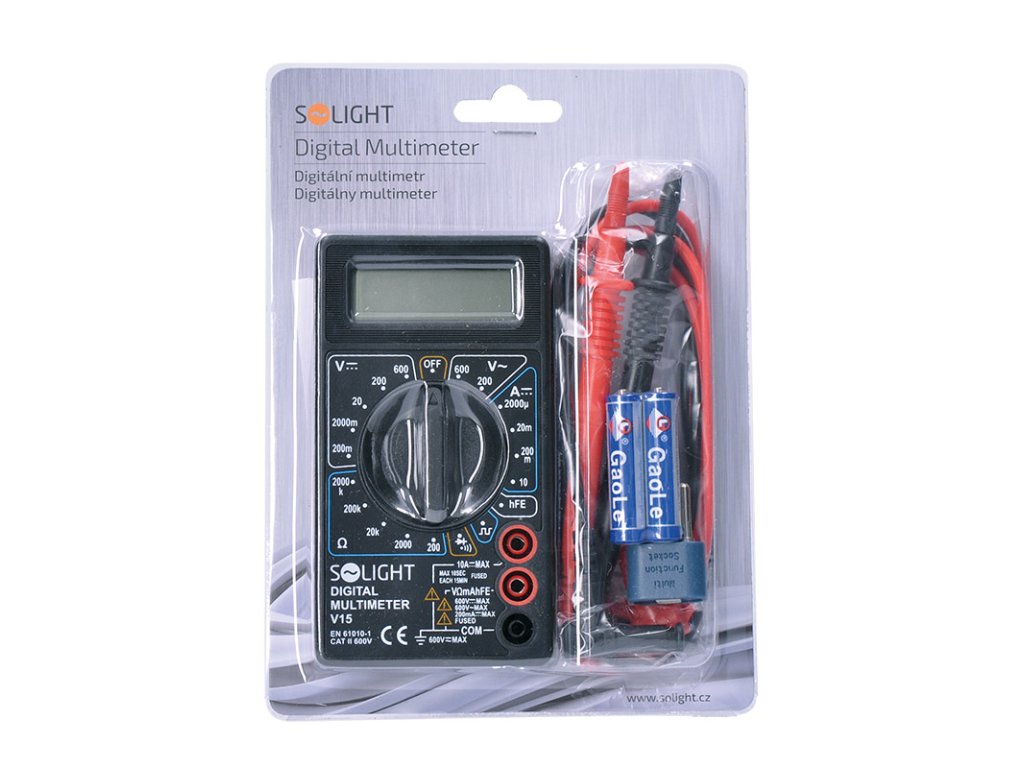 Digitální multimetr pro měření stejnosměrného (200mV - 600V) a střídavého napětí (200V - 600V), stejnosměrného proudu (200µA - 10A) a odporu (200? - 2000k?). Test diody, měření polarity, test spojitosti obvodů. Ochrana proti přetížení s pojistkami 500mA/500V a 10A/500V. Bzučák pro indikaci spojitosti a digitální displej. Výměnné kabely s měřícími hroty (délka 75 cm). Napájení: 2x AAA baterie (součástí balení), indikátor slabých baterií. Rozměry: 6,0 x 11,5 x 2,0 cm.
