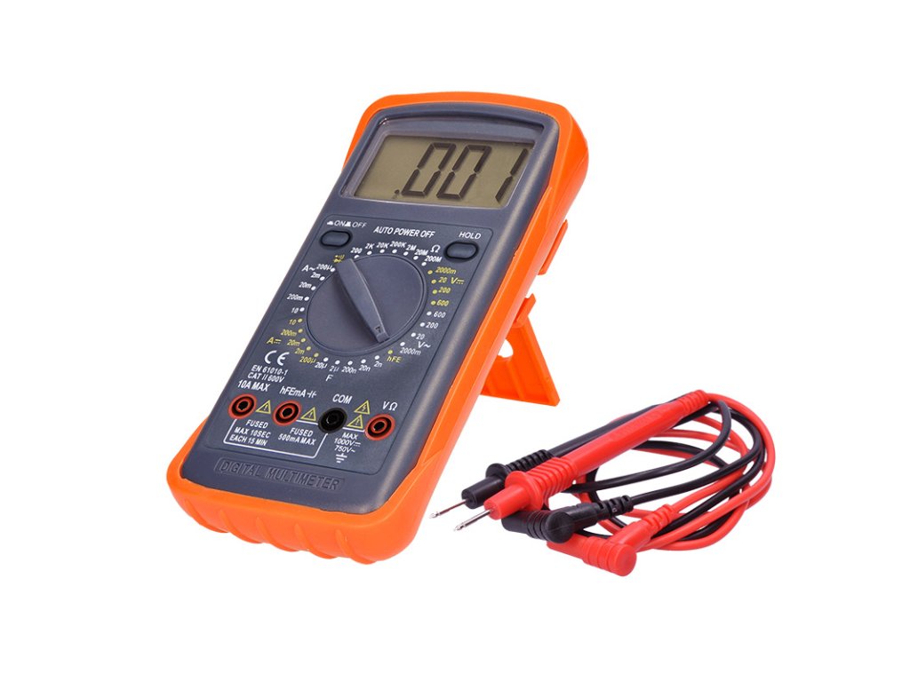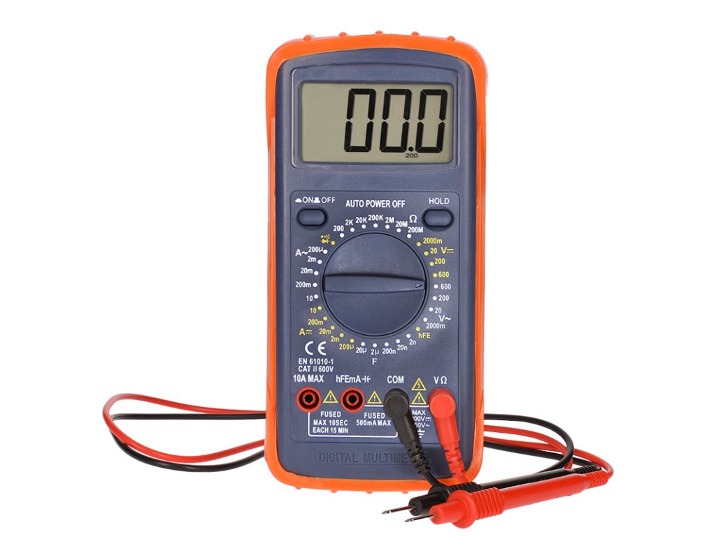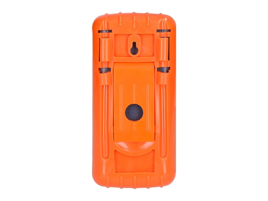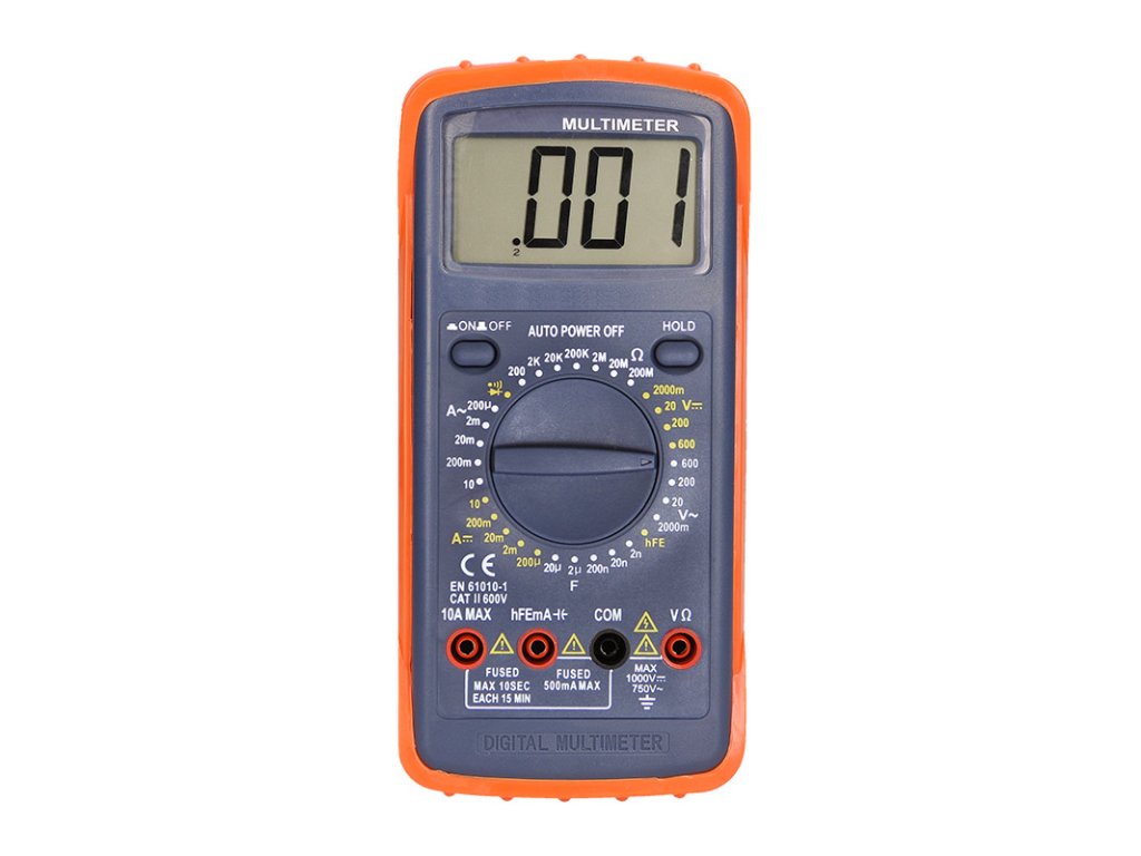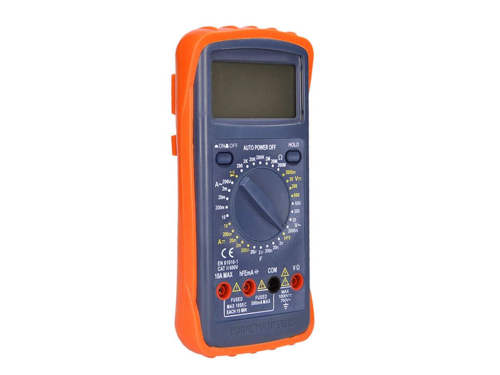 Digitální multimetr pro měření napětí, proudu, odporu a kapacity. Nabízí test spojitosti obvodu, diodový test a měření hFE (0-1000). Funkce automatického vypnutí a uchování poslední hodnoty. Ochrana proti přetížení a indikace vybité baterie. Napětí: DC 2000mV - 600V (± 0,5%), AC 2000mV - 600V (± 1%), proud: DC 200uA - 10A (± 1,8%), rezistence: 200? - 200M? (± 1%). Kapacita: 2nF - 20uF (± 4%). Napájení: 9V baterie (nejsou součástí balení). Rozměry: 193x90x37 mm, hmotnost: 251g.