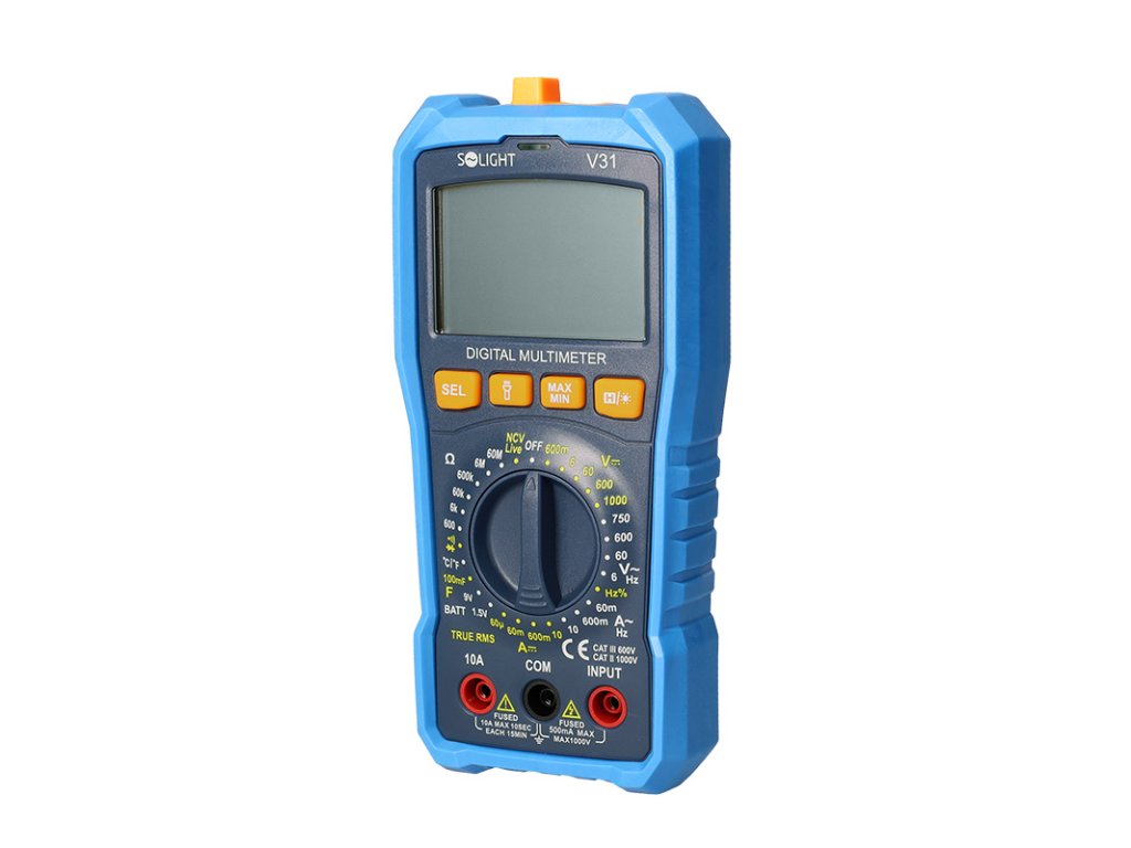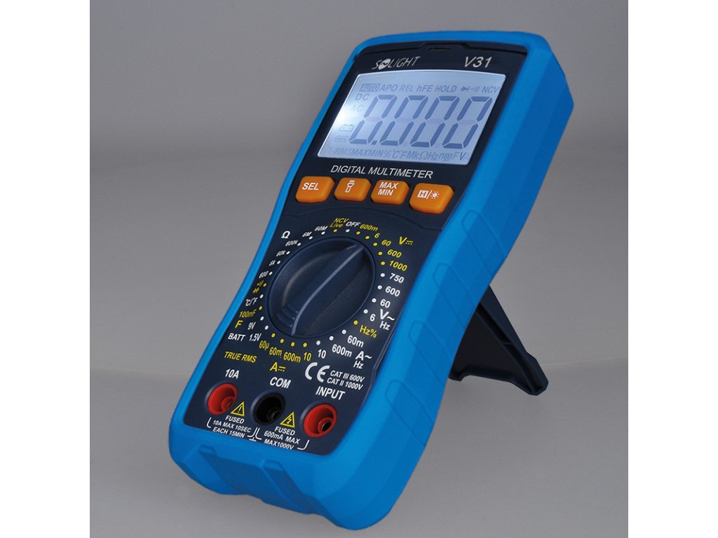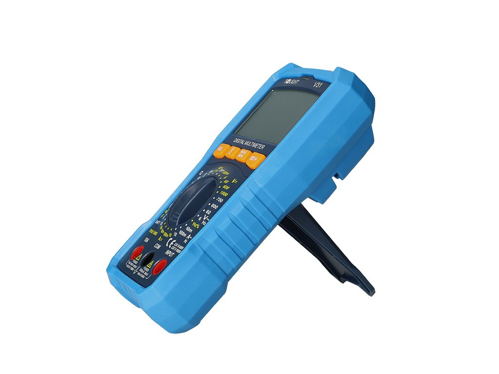 Multimetr pro měření AC a DC napětí, proudu, odporu, frekvence, kapacity a teploty. Nabízí true RMS měření, tranzistorový a diodový test, test spojitosti obvodu, NCV (bezkontaktní detektor napětí) a LIVE (zkoušečka vodičů pod napětím). Funkce HOLD pro uložení hodnoty, MIN/MAX naměřená hodnota, LED svítilna a indikace vybité baterie. Ochrana proti přetížení s pojistkami 10A/600V a 500mA/600V. Napájení: 2x AAA baterie. Rozměry: 186x87x50 mm, hmotnost: 310g.