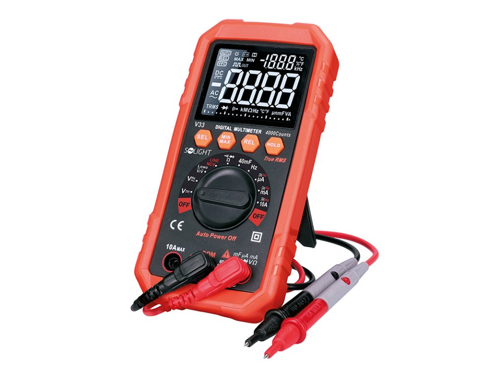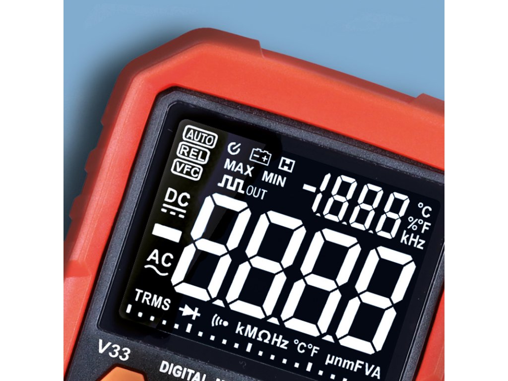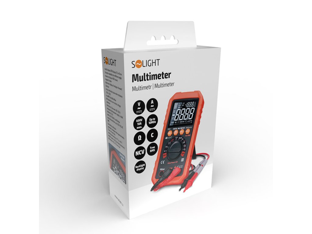 Multimetr s podsvíceným EBTN displejem (51,5 x 40 mm) pro snadnou čitelnost. Měření DC/AC napětí (400mV - 600V), DC/AC proudu (400µA - 10A), odporu (400? - 40M?), kapacity (40nF - 40mF) a frekvence (4Hz - 10MHz). Teplota od 0°C do 50°C a diodový test. Funkce true RMS, Hold, Min/Max, NCV detekce napětí (30V - 1000V), kontinuita obvodu s bzučákem. Ochrana proti přetížení a certifikace CAT III 600V. Napájení: 2x AAA baterie, automatické vypnutí po 15 minutách. Rozměry: 155 x 71,9 x 45 mm, hmotnost: 300 g.