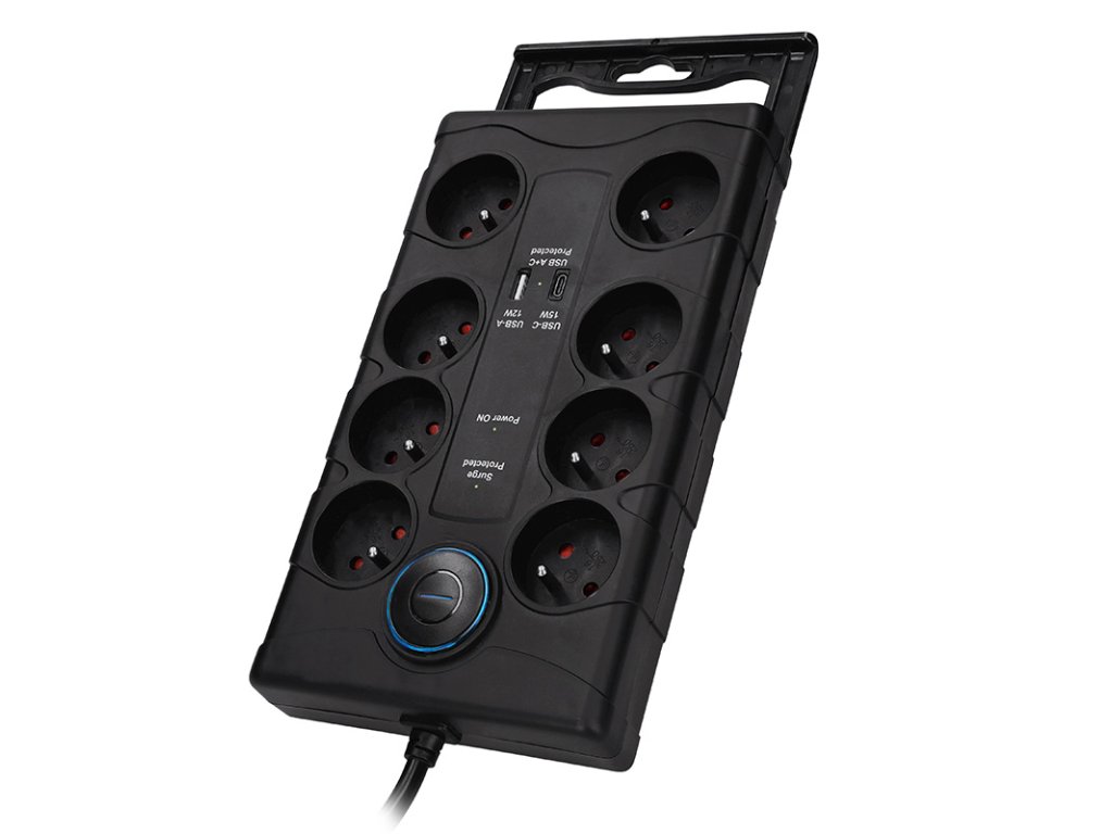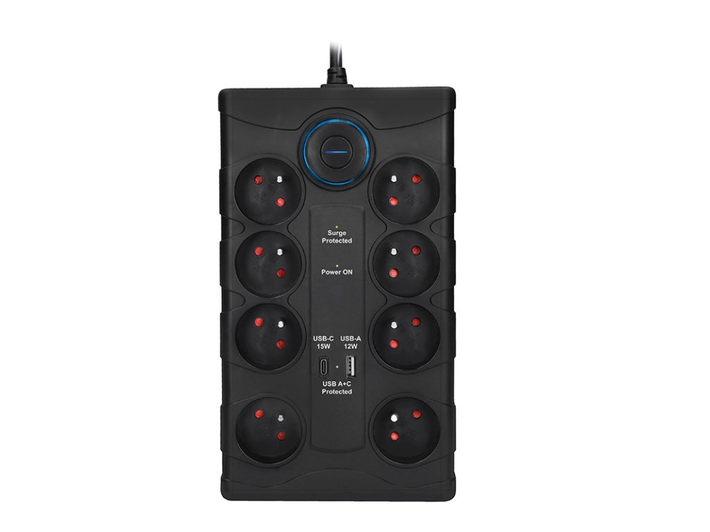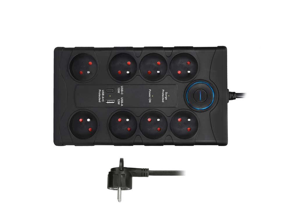 Spolehlivá přepěťová ochrana s integrovanou USB nabíječkou chrání vaše zařízení proti náhlým výkyvům napětí. Díky osmi zásuvkám a dvěma USB portům je ideální do domácnosti i kanceláře. S maximální zátěží až 3680 W zvládne i energeticky náročnější spotřebiče.