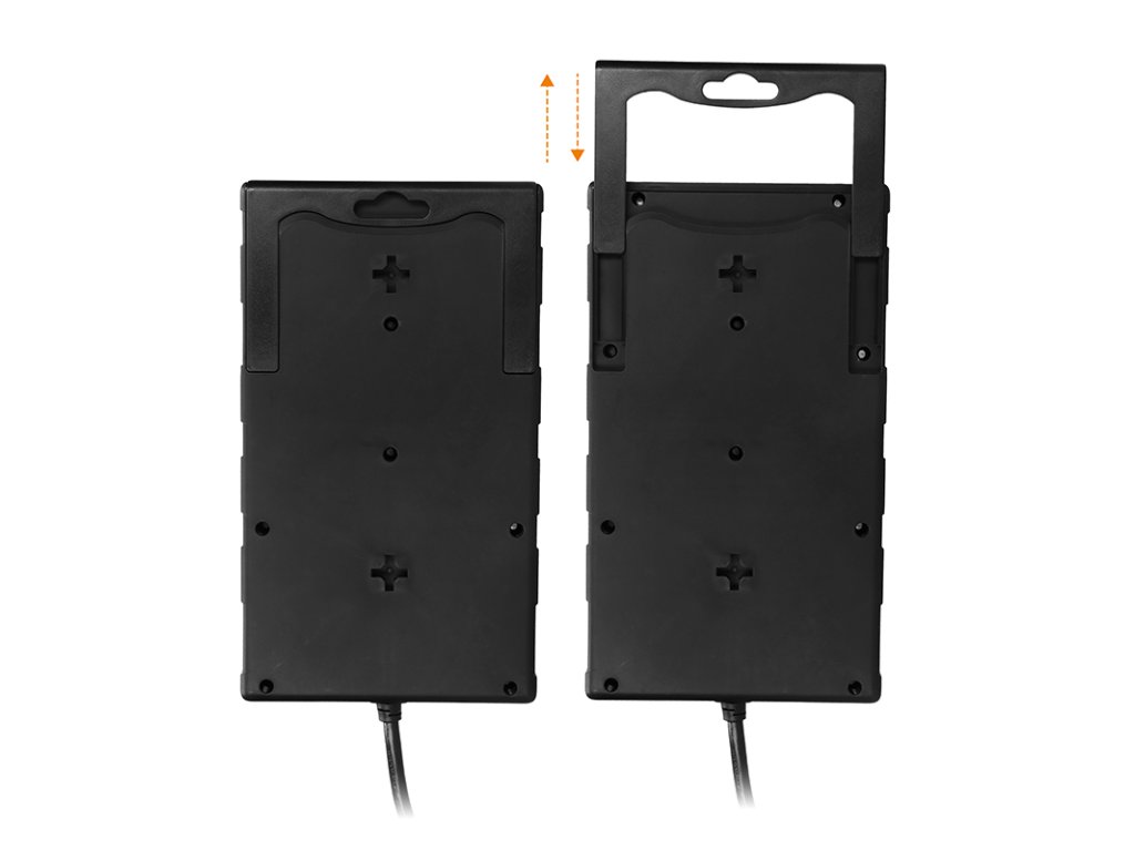 Robustní, dva metry dlouhý přívodní kabel poskytuje flexibilitu při umístění. Dvě oddělené zásuvky pojmou i větší napájecí adaptéry bez překážení ostatním zásuvkám. Výsuvný držák na zadní straně slouží k uspořádání kabelů, případně k zavěšení nebo přenášení. Nechybí ani montážní otvory pro pevné uchycení.