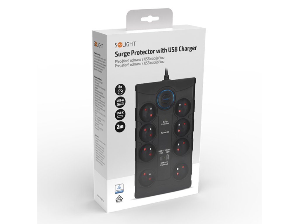 Solight přepěťová ochrana, 8z, USB A+CA, 2m, černá