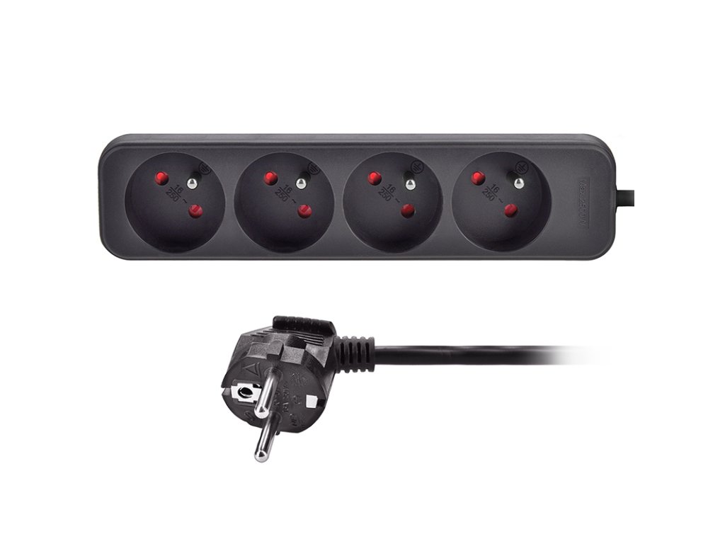 Praktický černý prodlužovací kabel s délkou 3 metry a čtyřmi zásuvkami umožní přivést elektrickou energii tam, kde není k dispozici pevná zásuvka. Ideální pro domácí i kancelářské využití.