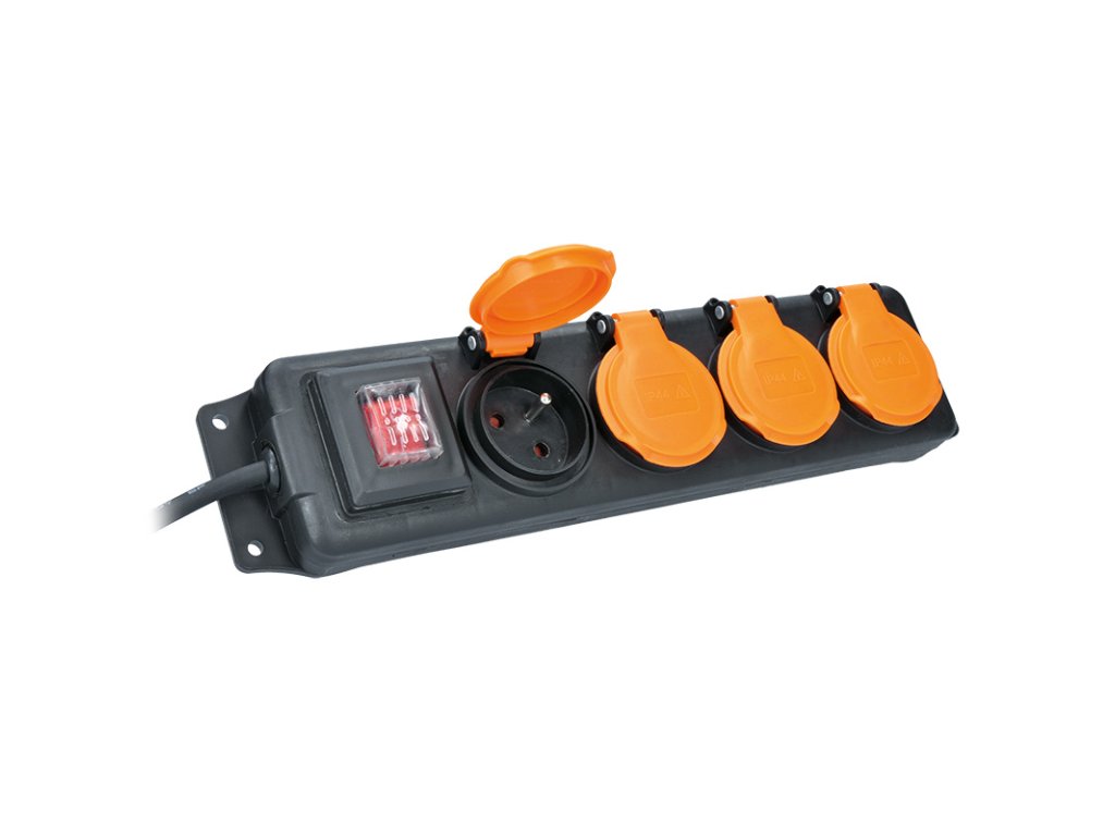 Prodlužovací přívod s gumovým kabelem, čtyřmi zásuvkami a praktickým vypínačem je ideální volbou pro práci na zahradě, stavbě nebo v dílně. Robustní konstrukce zajišťuje spolehlivý provoz a krytím IP44 zaručuje odolnost proti stříkající vodě ze všech směrů.