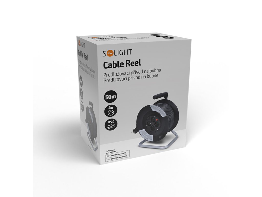 Solight prodlužovací přívod na bubnu, 4 zásuvky, 50m, černý kabel, 3x 1,5mm2