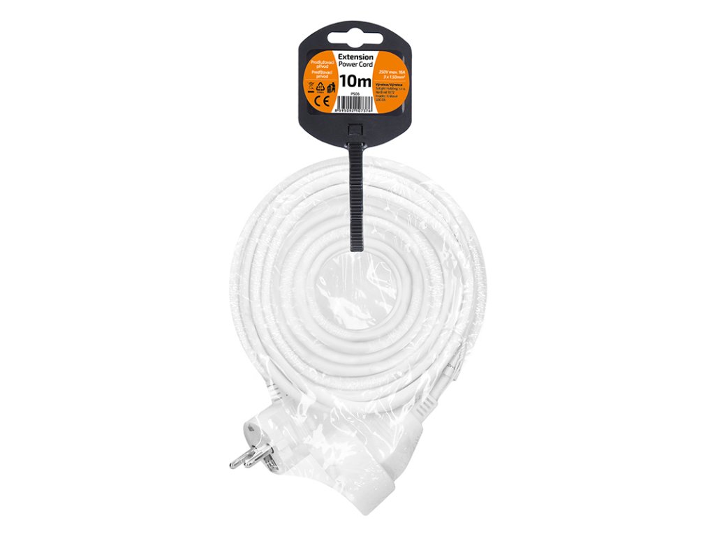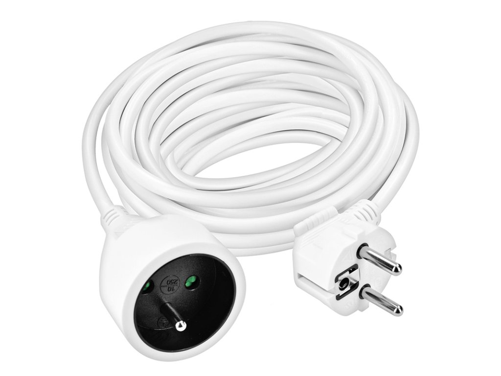 Kompaktní bílý prodlužovací kabel s délkou 10 metrů a jednou zásuvkou je ideální pro jednoduché prodloužení elektrické energie v domácnosti, kanceláři nebo dílně. Vhodný pro připojení samostatného zařízení mimo dosah pevné zásuvky.