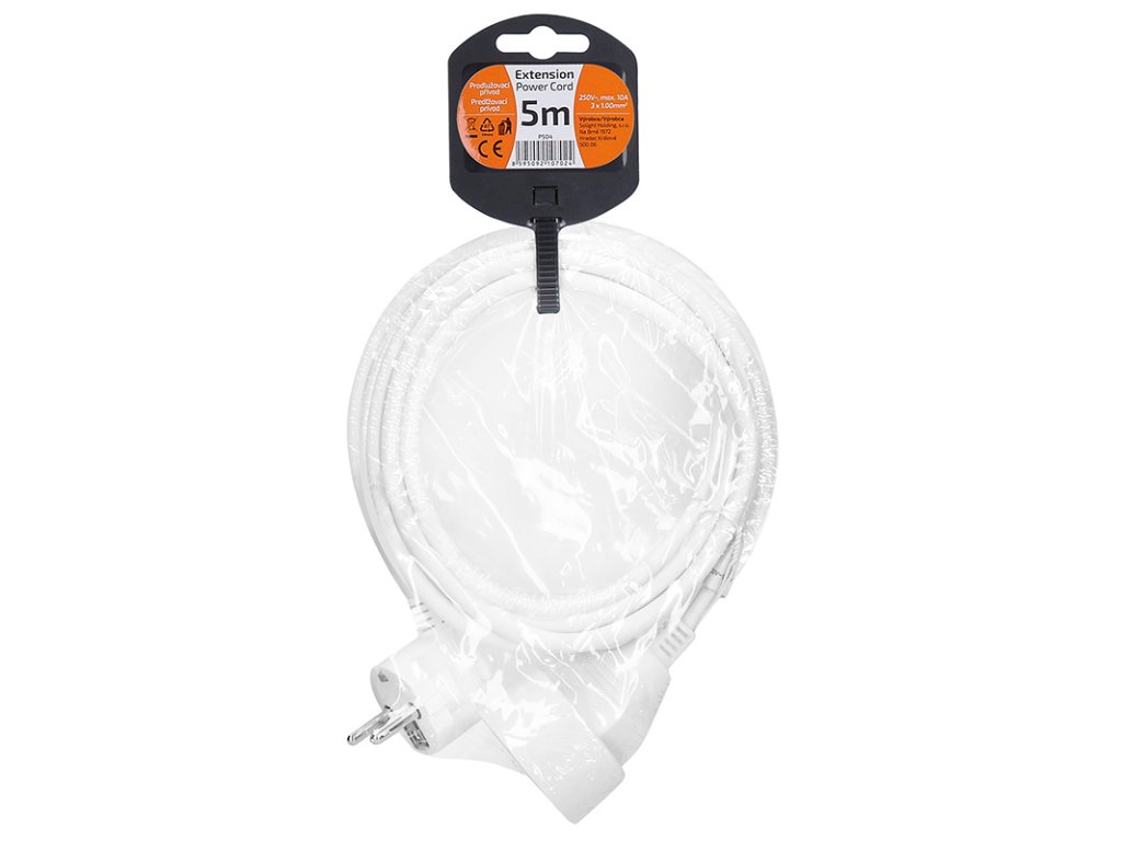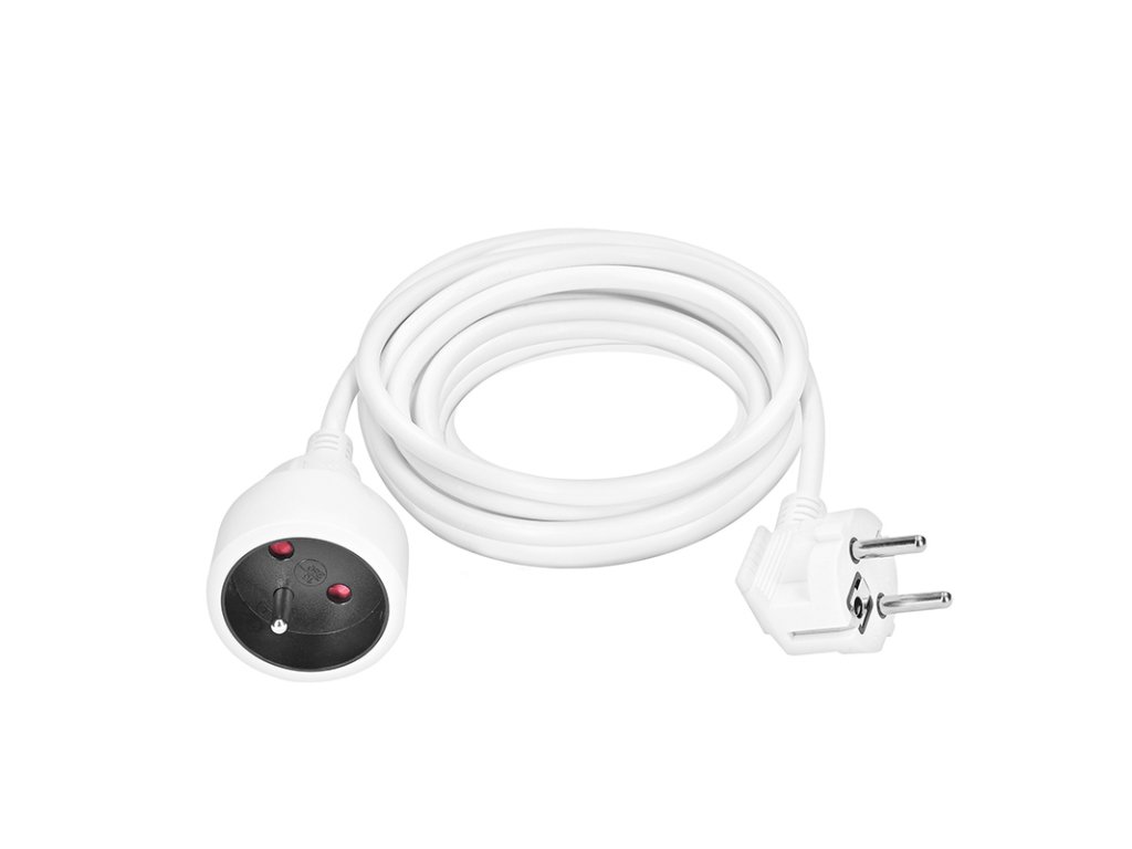 Kompaktní bílý prodlužovací kabel s délkou 5 metrů a jednou zásuvkou je ideální pro jednoduché prodloužení elektrické energie v domácnosti, kanceláři nebo dílně. Vhodný pro připojení samostatného zařízení mimo dosah pevné zásuvky.