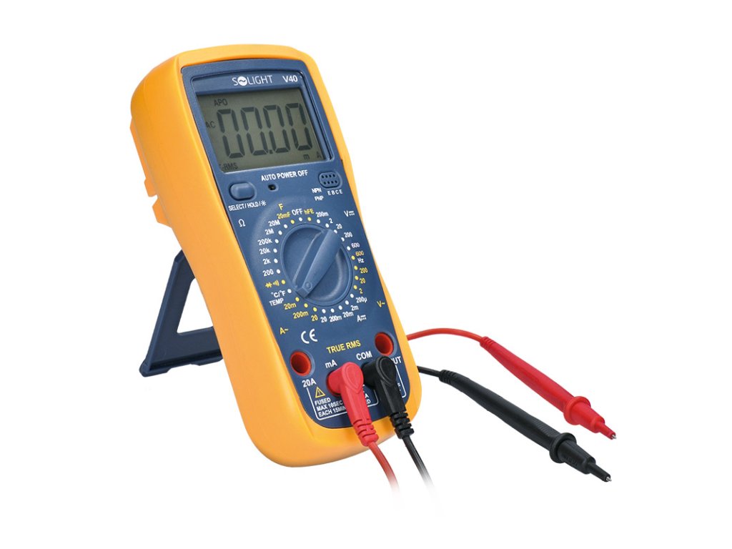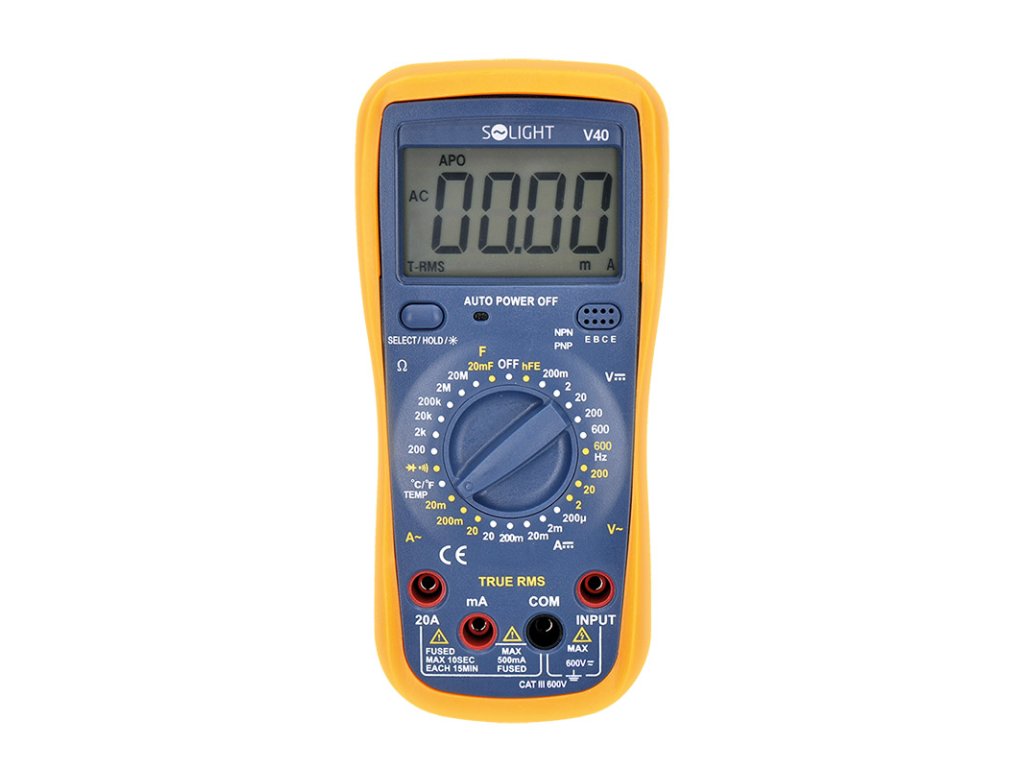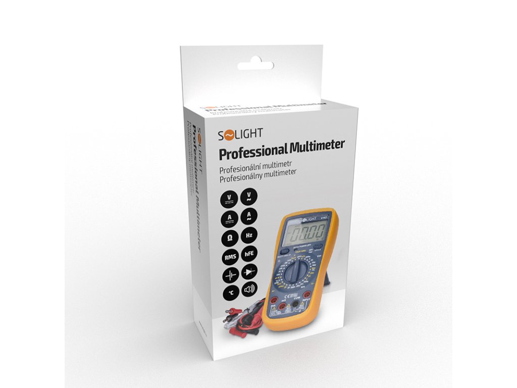 Digitální multimetr pro měření proudu, napětí, odporu, frekvence, kapacity a teploty. Nabízí true RMS měření (efektivní hodnota střídavých průběhů), tranzistorový a diodový test, test spojitosti obvodu, a měření parametrů hFE. Automatické vypnutí a uchování poslední hodnoty. Ochrana proti přetížení s elektronickou pojistkou. Napájení: 9V baterie. Rozsahy: DCV (200mV - 600V), ACV (2V - 600V), DCA (200µA - 20A), OHM (200? - 20M?), kapacita (20nF - 20mF), teplota (-40°C - 1000°C). Rozměry: 189 x 89 x 55 mm.