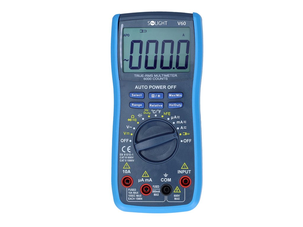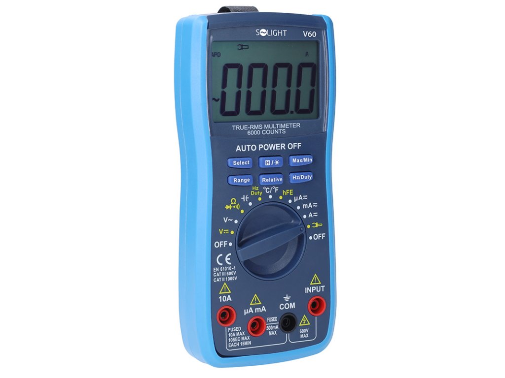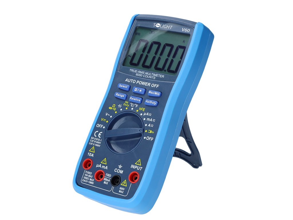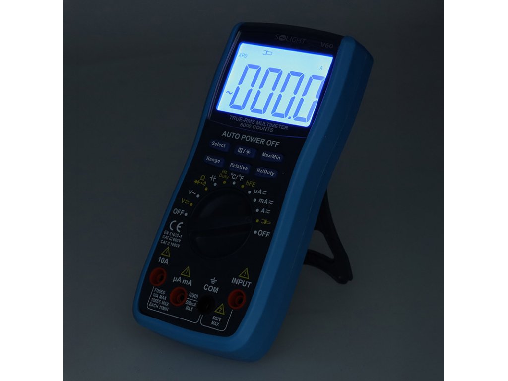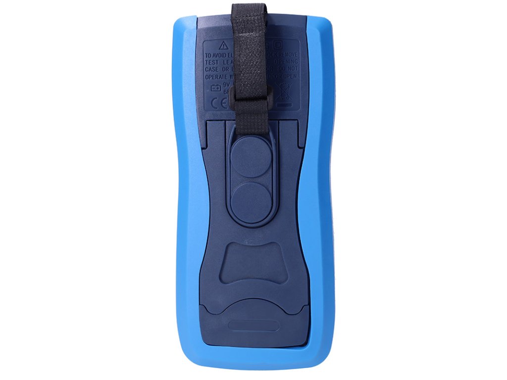 Digitální multimetr s podsvíceným LCD displejem (64 × 42 mm) a maximálním zobrazením 6000 hodnot. Nabízí funkci HOLD pro zachování hodnoty, relativní měření (REL Mode) a funkci MAX/MIN pro záznam extrémních hodnot. Test diod, tranzistorů hFE, test spojitosti s bzučákem. Automatická detekce polarity, indikace nebezpečného napětí. Měří DC/AC napětí (600mV – 1000V), DC/AC proud (600µA – 10A), odpor (600? – 60M?), kapacitu (60nF – 60mF), teplotu (-40°C – 1000°C), frekvenci (10Hz – 10MHz). Ochrana proti přetížení a vysokému napětí (1000V DC / 750V AC). Napájení: 9V baterie (6F22). Rozměry: 190 × 90 × 35 mm, hmotnost: 357 g.