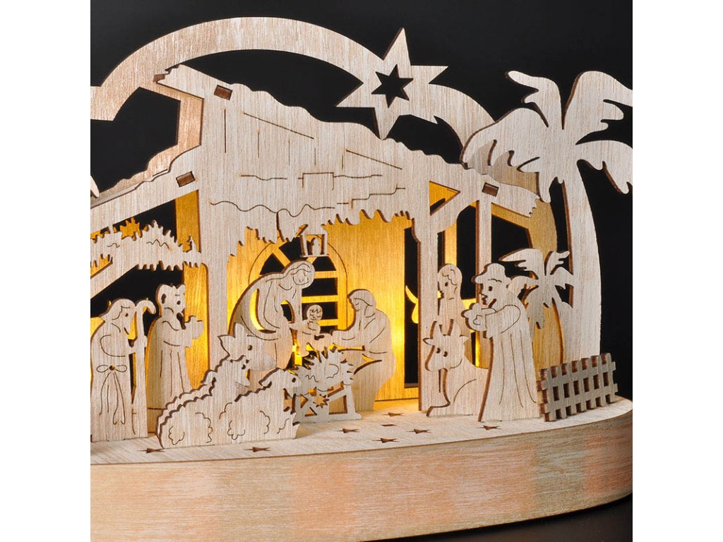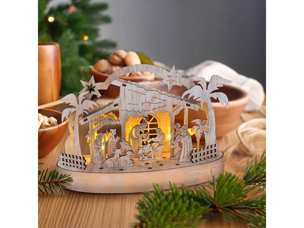 Klasický LED betlém v přírodní barvě dřeva přináší do vašeho domova tradiční vánoční atmosféru s nádechem elegance. Díky svým rozměrům 25 × 12 × 16 cm se hodí na komodu, poličku nebo sváteční stůl. Pět teple bílých LED diod jemně osvětluje střed scény a zvýrazňuje detaily postaviček i architektury. Betlém je vyroben z kvalitního dřeva a svou jednoduchostí se hodí do každého interiéru.