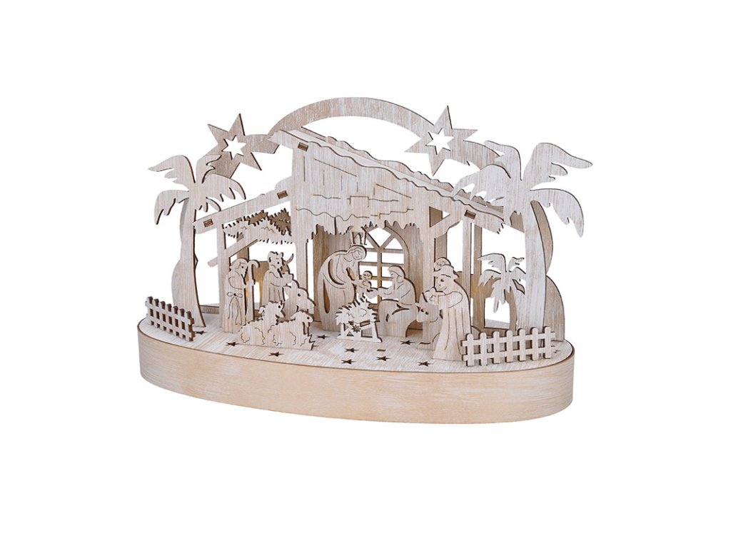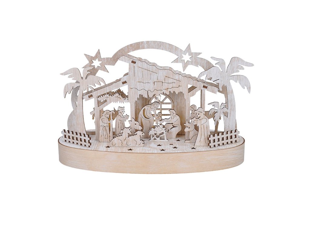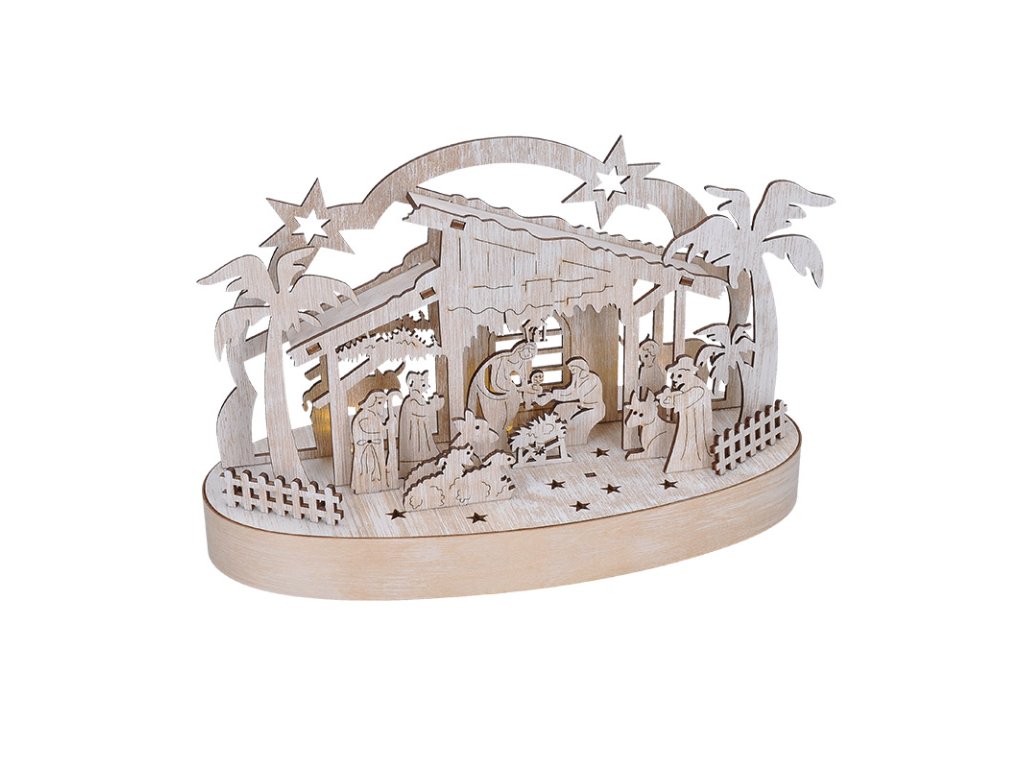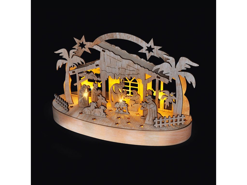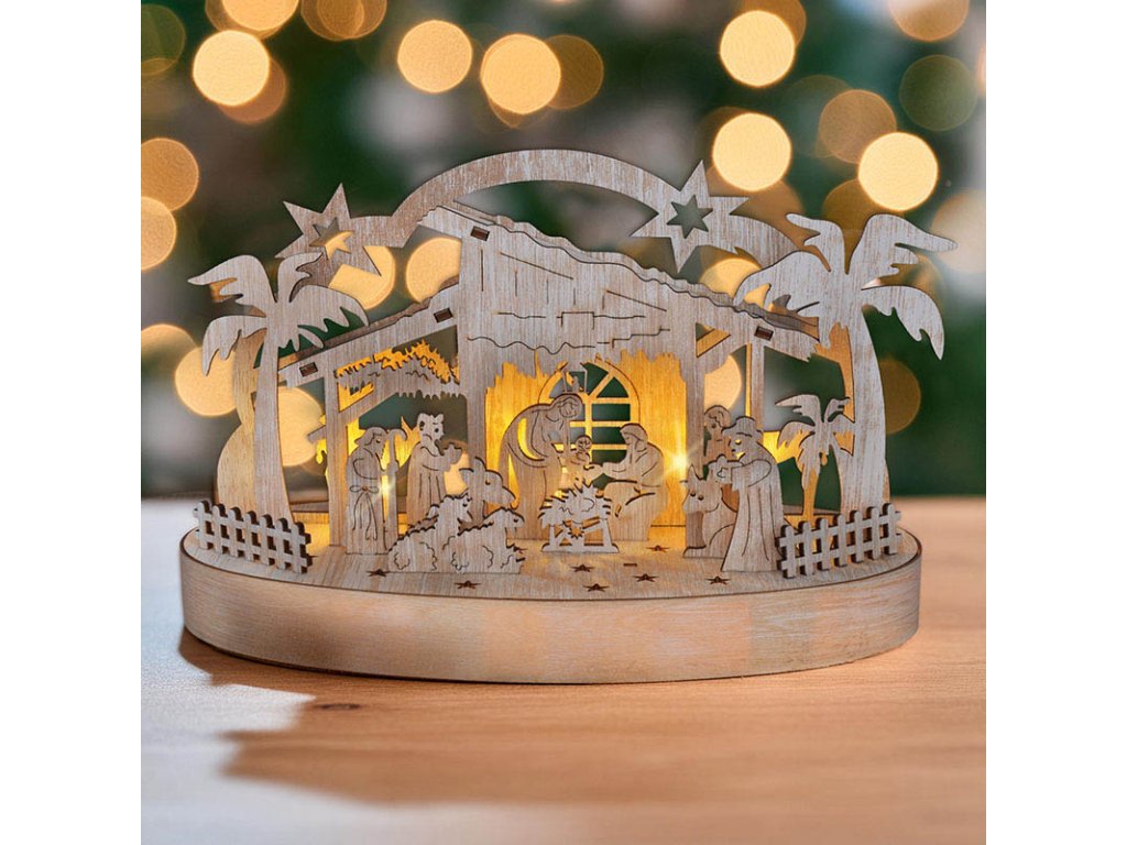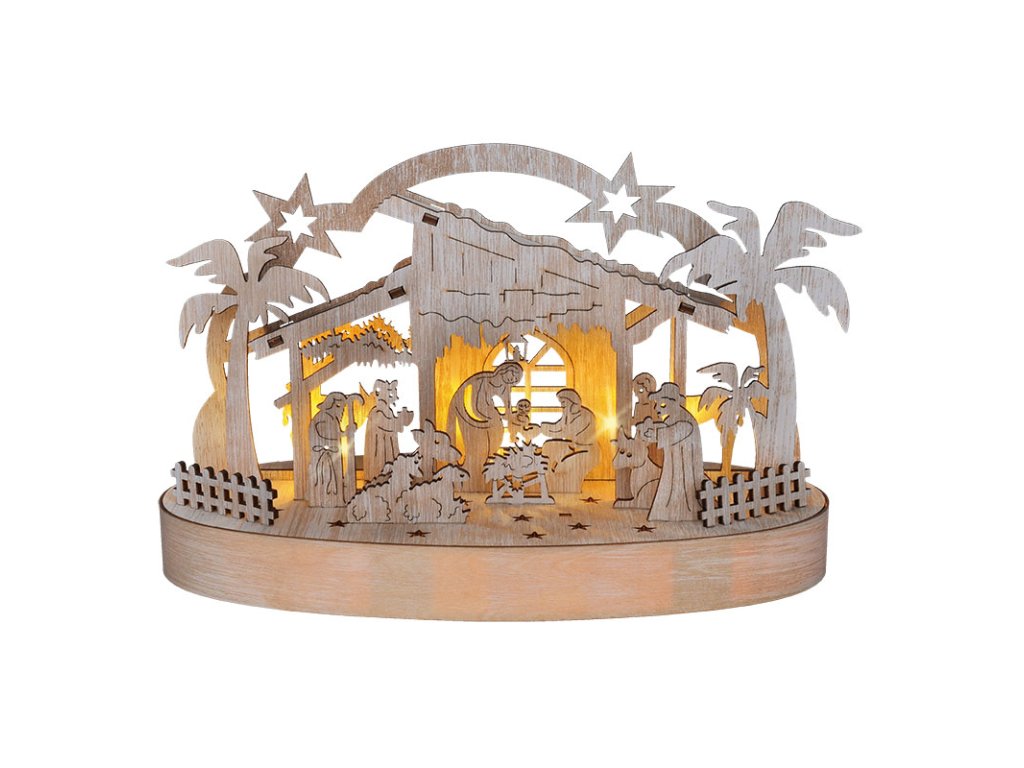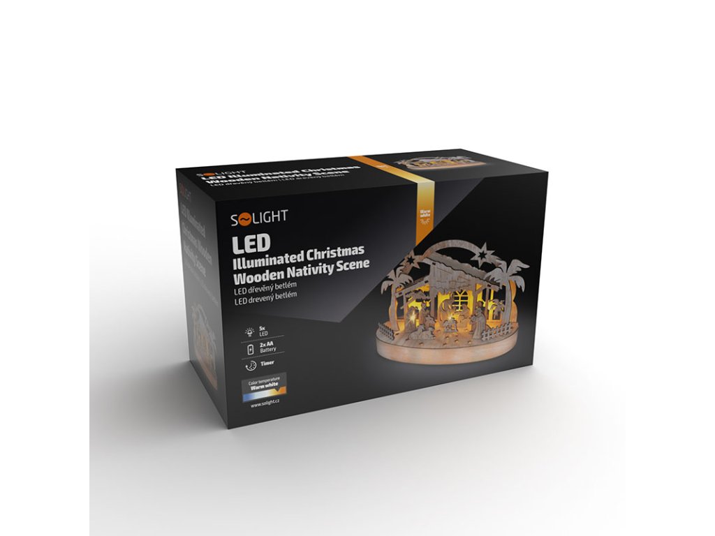 Solight vánoční dřevěný betlém podsvícený, 5x LED, přírodní dřevo, 25cm, 2x AA