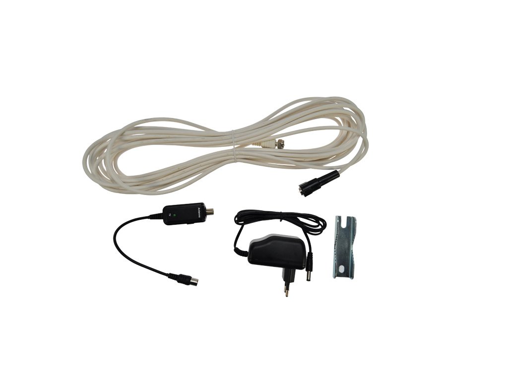 Balení obsahuje: 10 m koaxiální kabel, konektory, zesilovač, adaptér a držák na uchycení