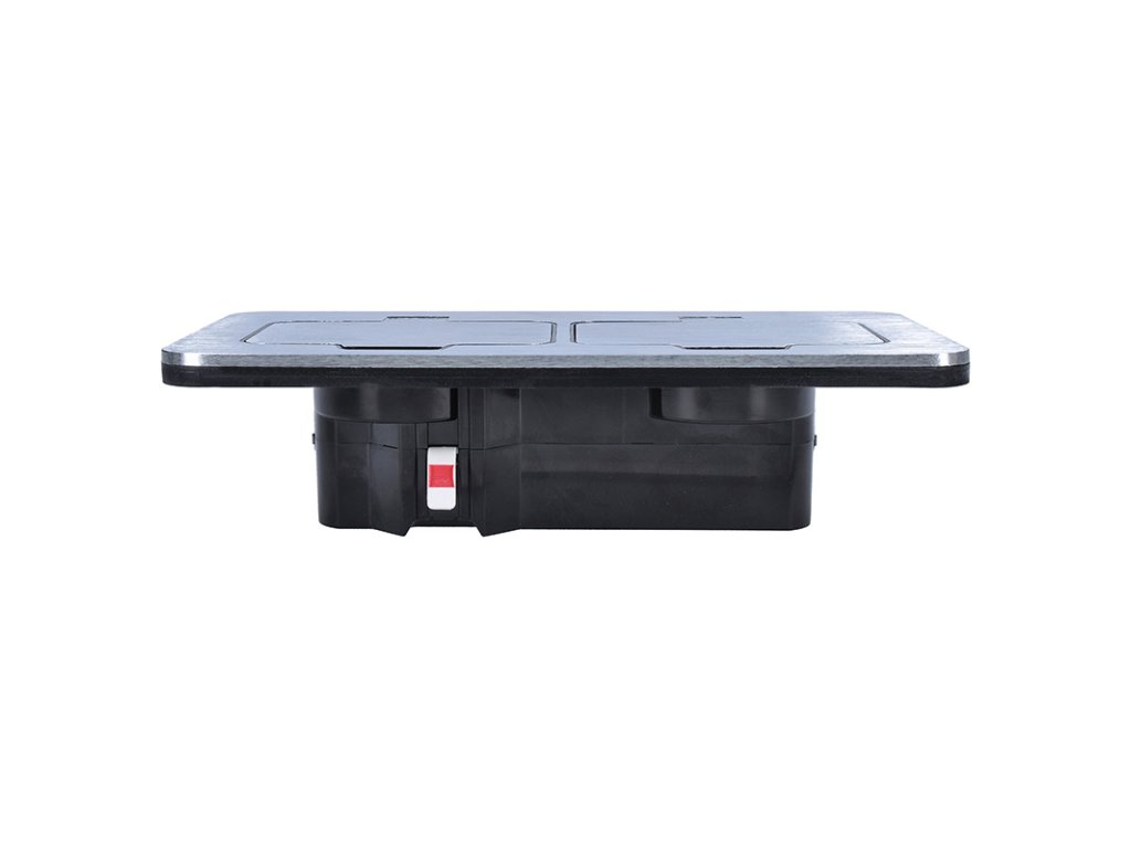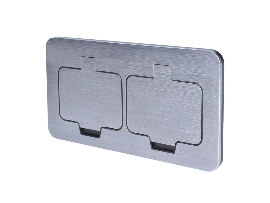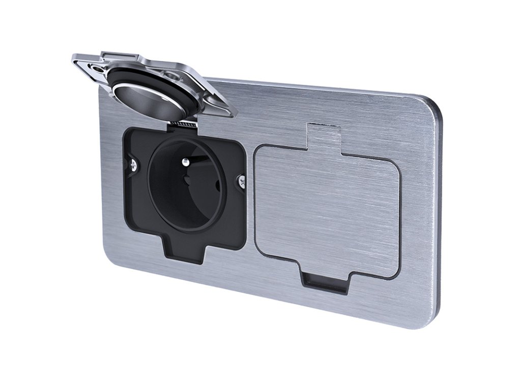 Vrchní kryt zásuvky je vyroben z odolné zinkové slitiny, která zajišťuje pevnost a zároveň ochranu proti korozi. Na povrchu nejsou viditelné žádné šrouby – montážní otvory zůstávají skryté pod každým víčkem. Díky tomu působí zásuvka elegantně a profesionálně a zároveň se snadno čistí.