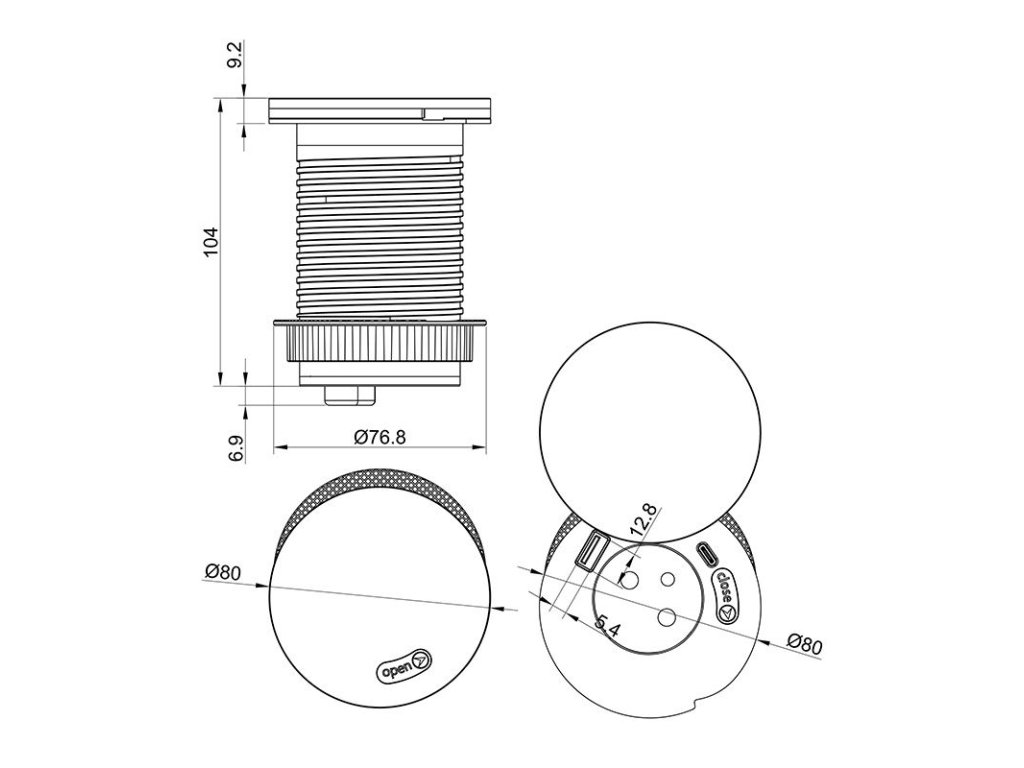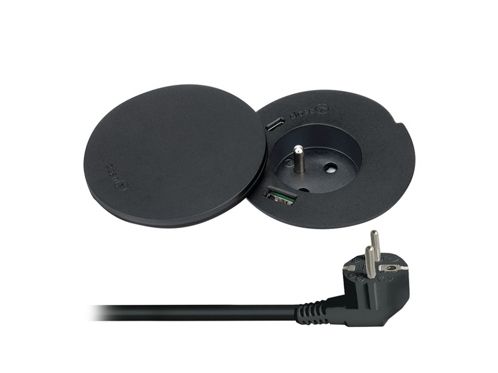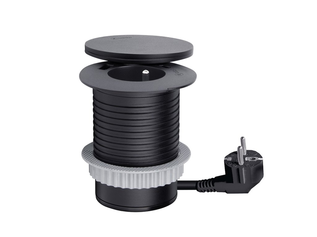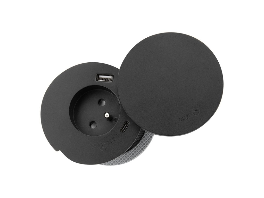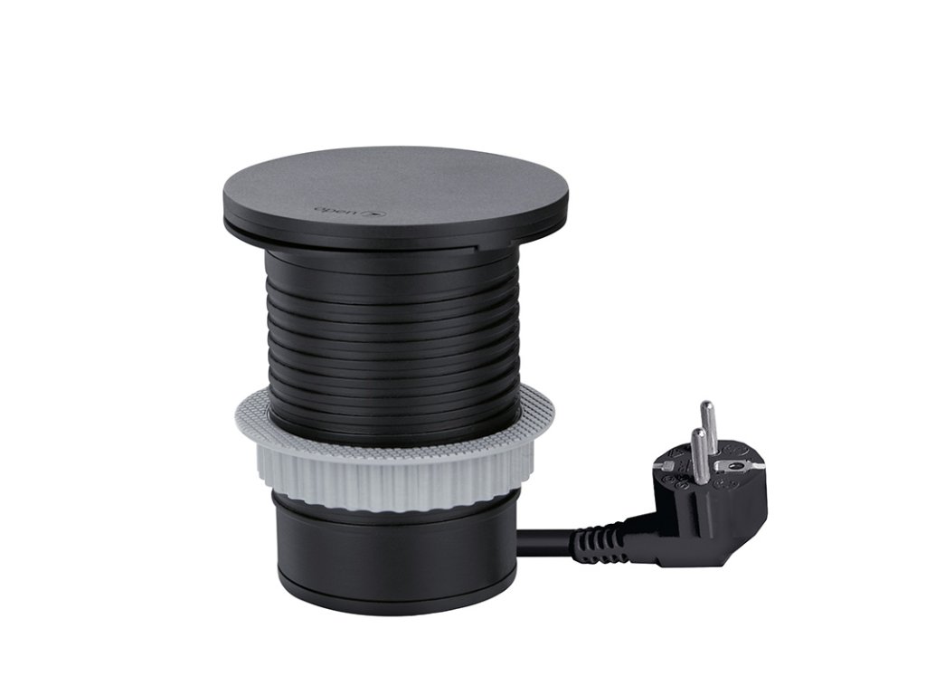 Zásuvka se instaluje do výřezu v desce stolu a fixuje pomocí šroubovacího mechanismu. Víčko stačí otočit a odkryje nebo se zakryje napájecí modul. Pracovní plocha zůstává čistá a síťová zásuvka i USB porty jsou chráněné proti prachu nebo drobným nečistotám.