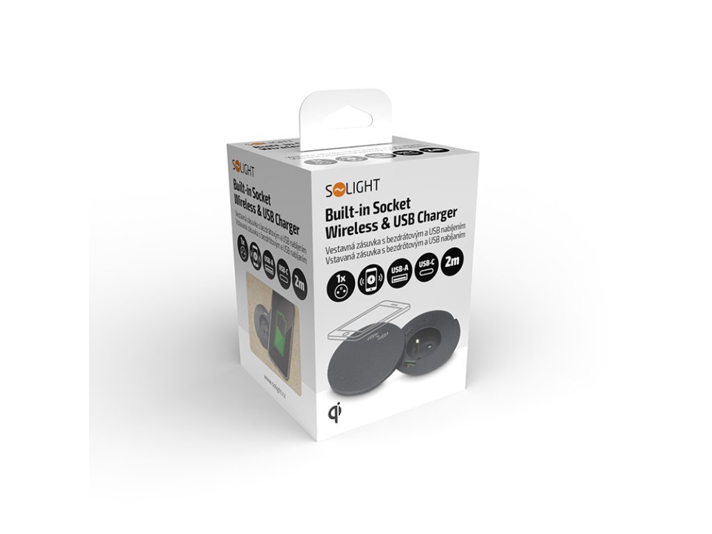 Solight vestavná zásuvka + USB A+C + Wireless 10W, otočné víčko, kabel 2m, černá