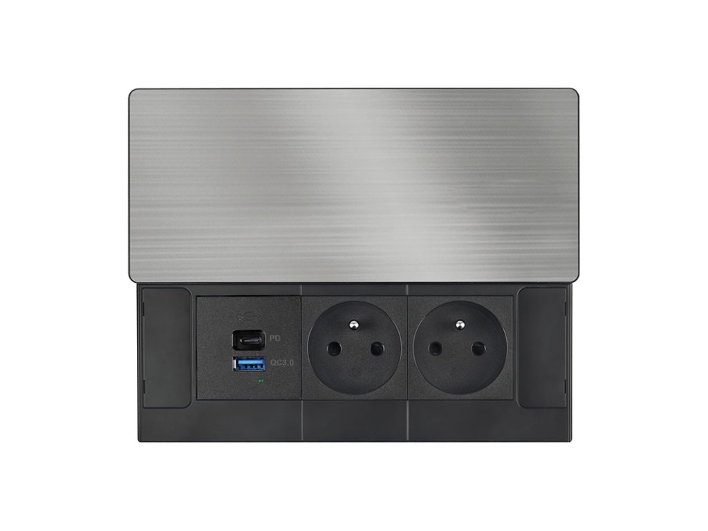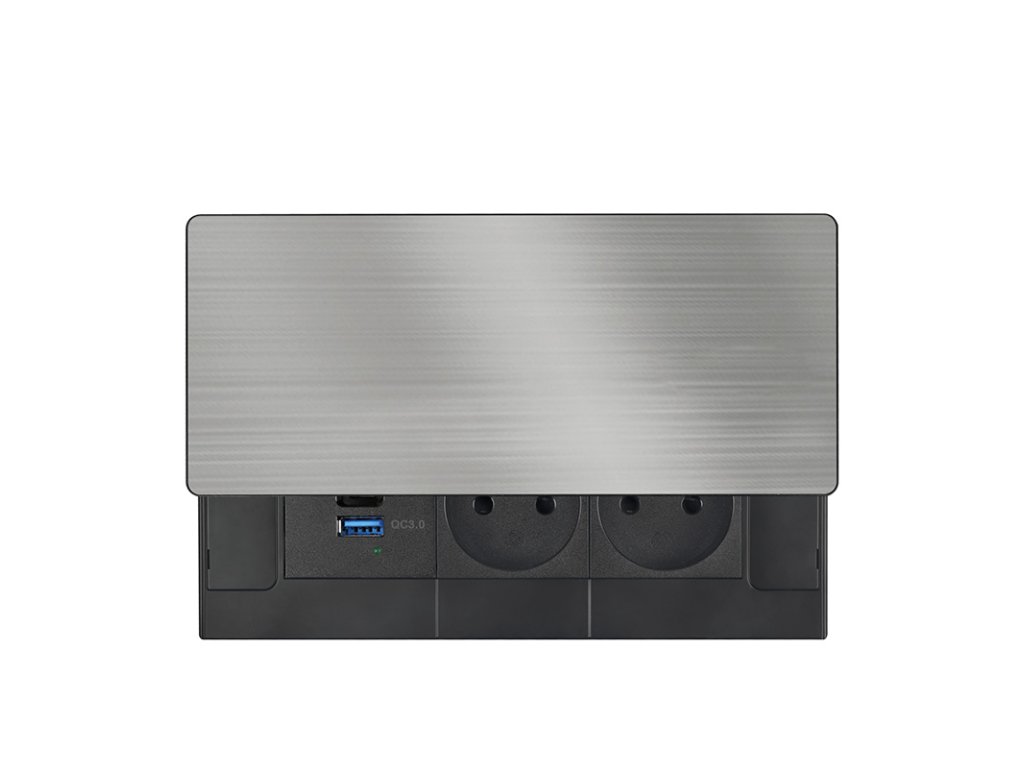 Vrchní kryt z matné tmavé nerez oceli (inox) působí elegantně a přirozeně zapadne do moderního interiéru. Nízký profil, čisté linie a nenápadné posuvné otevírání zachovávají vzhled pracovní plochy. Zásuvky i nabíjecí porty jsou kdykoli snadno přístupné jednoduchým pohybem ruky.