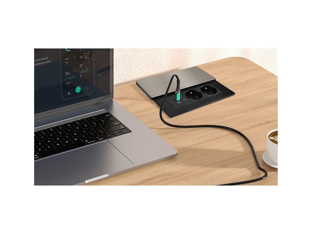 Vestavný blok zásuvek přivádí elektrickou energii i rychlé USB nabíjení přímo do pracovního stolu nebo kuchyňské linky. Dvě zásuvky 230 V s dětskými pojistkami jsou doplněny o USB-A a USB-C porty s technologií rychlého nabíjení až 65 W. To je výkon potřebný pro nabíjení notebooků i jiných energeticky náročných zařízení. Integrovaný posuvný kryt chrání vnitřek před prachem a nečistotami, napájecí kabel o délce 2 metry nabízí dostatek prostoru pro běžné umístění.