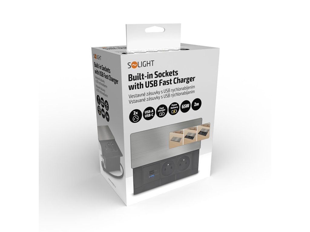 Solight vestavný blok zásuvek s posuvným krytem, 2 zásuvky, USB A+C 65W PD, 2m, stříbrný