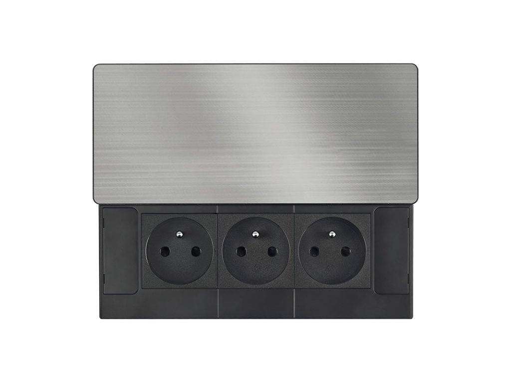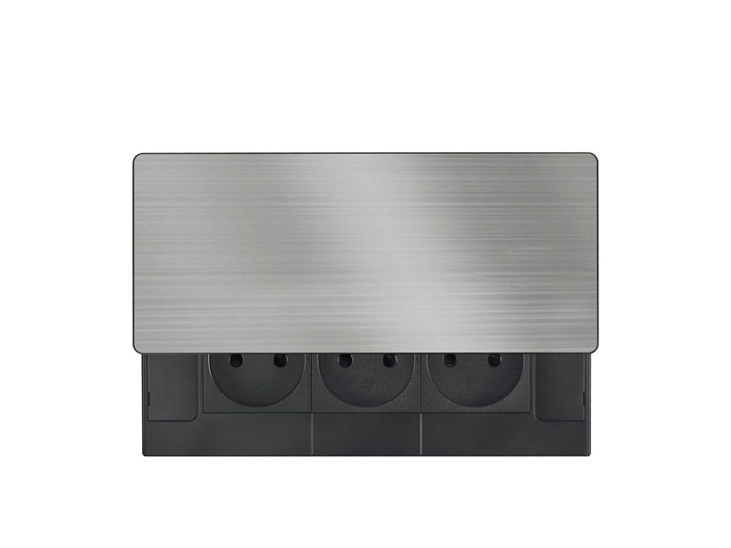 Vrchní kryt z matné tmavé nerez oceli (inox) působí elegantně a snadno se začlení do jakéhokoliv moderního interiéru. Nízký profil a posuvné otevírání šetří místo a nenarušují vzhled pracovní plochy. Ovládání je jednoduché, kryt stačí posunout a zásuvky jsou ihned k dispozici.