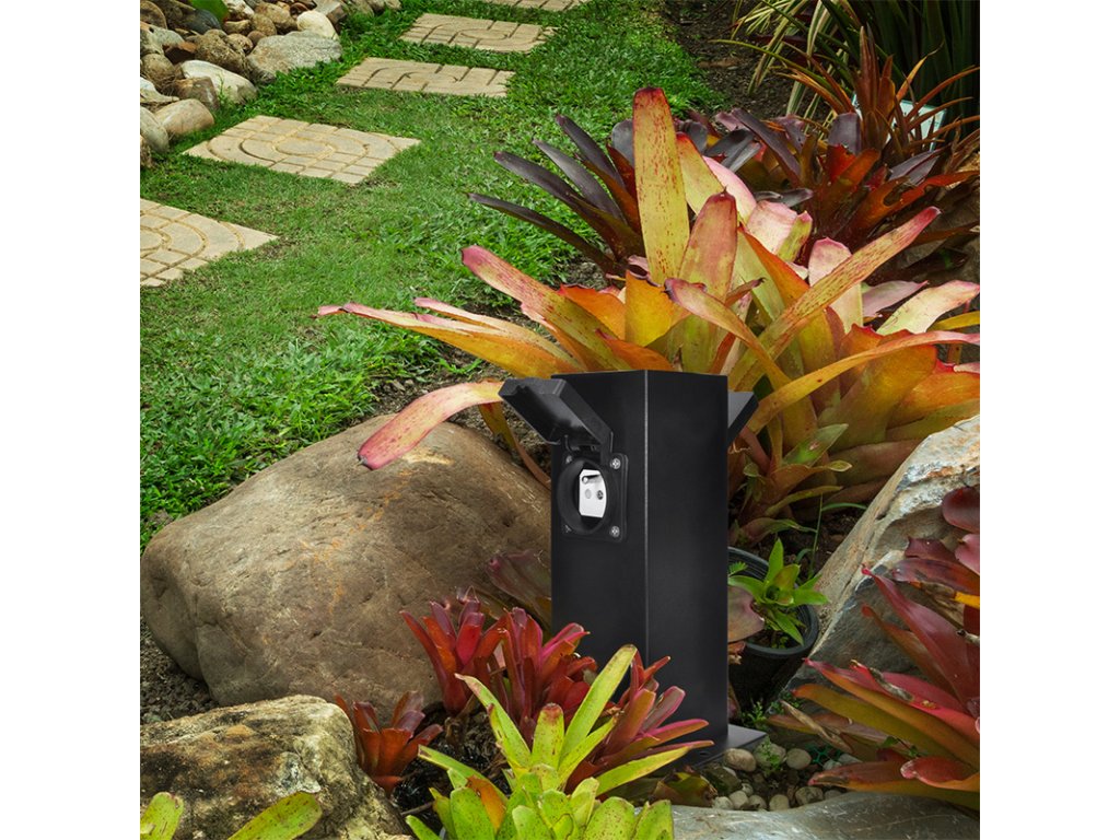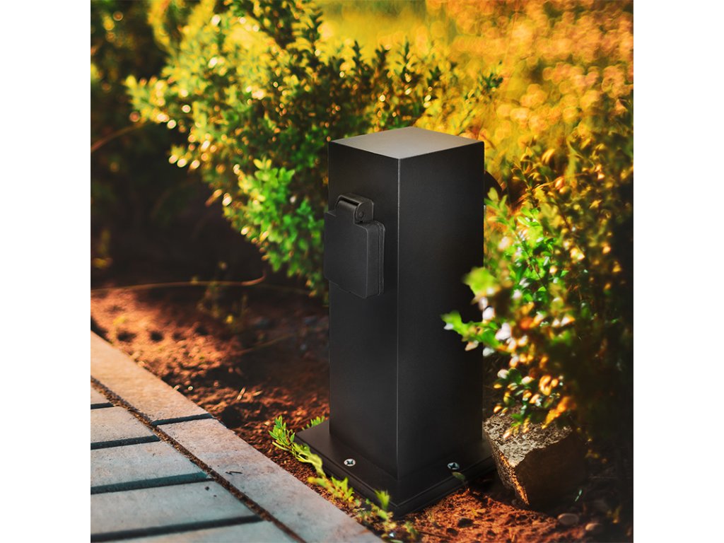 Dvě zásuvky s dětskými pojistkami jsou chráněny samouzavíratelnými krytkami, které brání vniknutí vlhkosti a nečistot. Díky krytí IP44 je sloupek vhodný i pro použití za deště nebo ve vlhčím prostředí. Zásuvky zvládnou zátěž až 3680 W (16 A při 230V~), což je ideální pro venkovní osvětlení, zahradní techniku i běžné spotřebiče. Vhodný pro domy, pergoly i firemní areály.