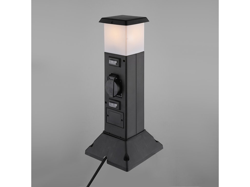 Dvě zásuvky s dětskými pojistkami a krytkami proti vlhkosti a prachu umožňují bezpečné připojení zahradní techniky, grilu nebo čerpadla. Každá zásuvka i světlo mají svůj vlastní vypínač pro pohodlné ovládání. Matná černá barva v kombinaci s černými krytkami zásuvek působí nenápadně a elegantně. Plastové tělo s krytím IP44 je odolné vůči vlhkosti i prachu. Do světla můžete vložit standardní LED žárovku s paticí E14. Ideální řešení pro stylové a bezpečné venkovní napájení.